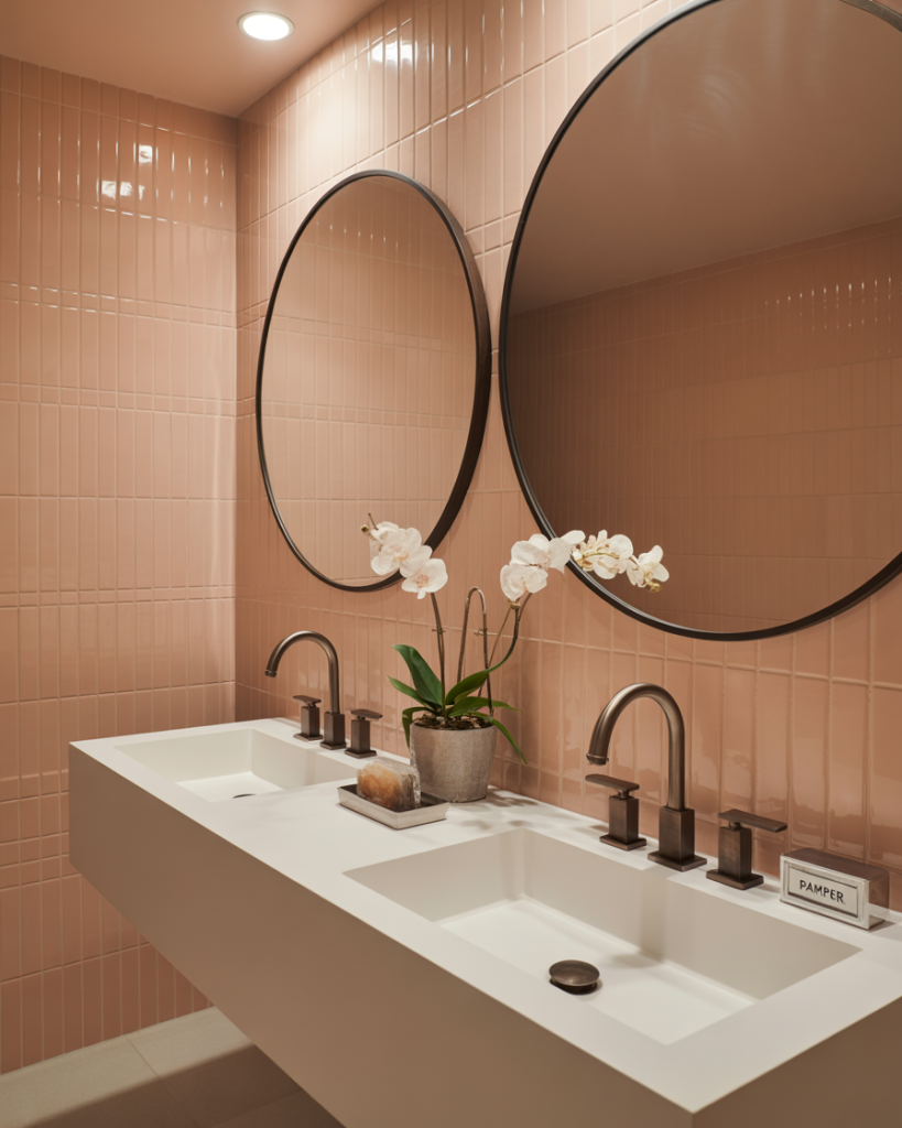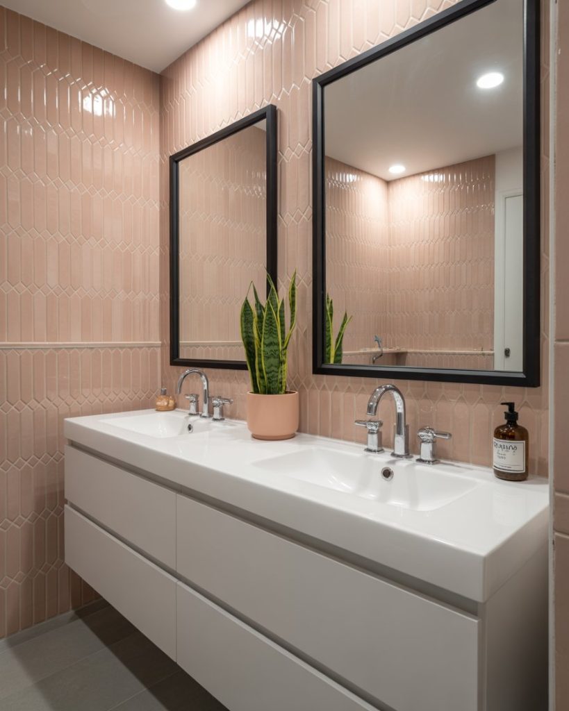 Pink bathrooms are trending in 2026 for homeowners who want something bold yet cute. Blush tiles with white sinks or dusty rose paired with black hardware add playful personality. Younger audiences inspired by Bloxburg often use pink as a cheerful feature in primary or guest spaces. Designers recommend balancing pink with neutral tones to keep it sophisticated.