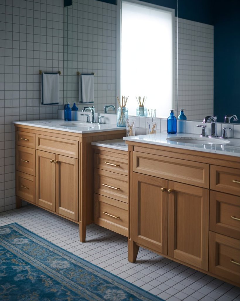 The jack and jill bathroom remains a family favorite in 2026. With grey tiles, double vanities, and blue or black and white accents, it is both functional and stylish. I always wished my college dorm had this setup—less waiting and more privacy. Studio McGee often emphasizes how smart layouts and modern storage make shared bathrooms work beautifully.