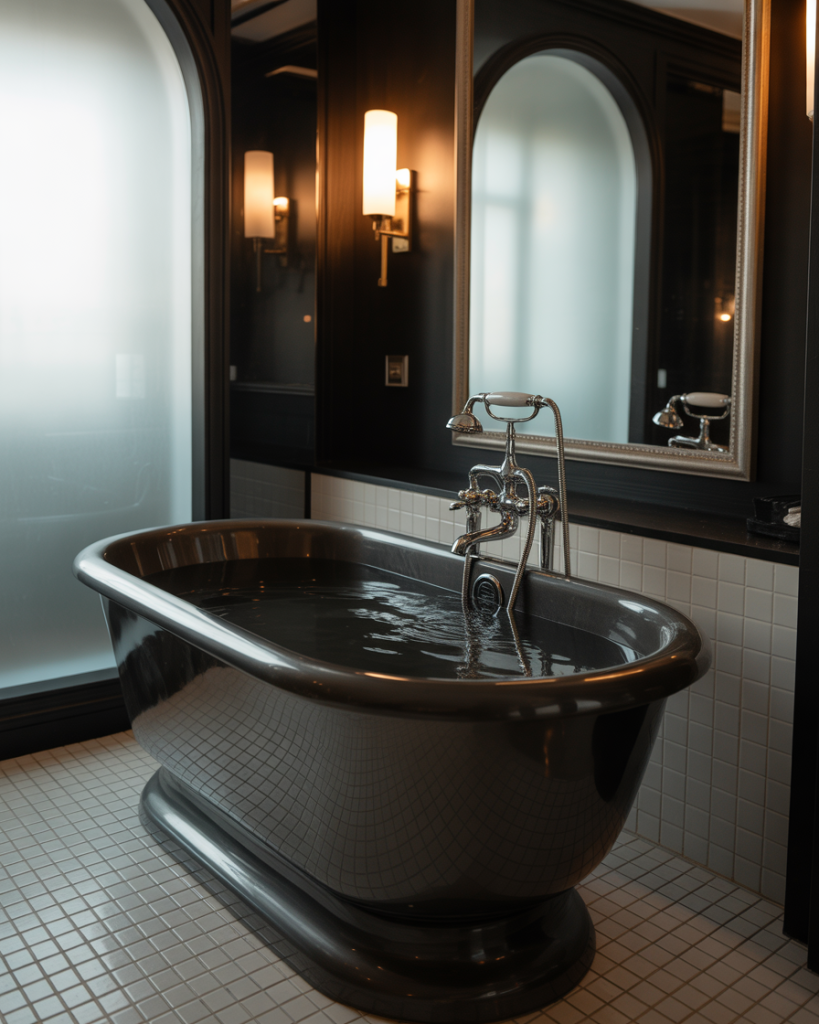 Dark bathrooms feel dramatic and moody, perfect for bold homeowners. Deep black, charcoal, or navy paired with white marble creates instant boutique-hotel vibes. Even small full or ensuite layouts benefit from the coziness of dark finishes. Warm lighting is key to prevent the space from feeling cold. I once saw a guest bath painted in deep green-black—it looked unforgettable.
