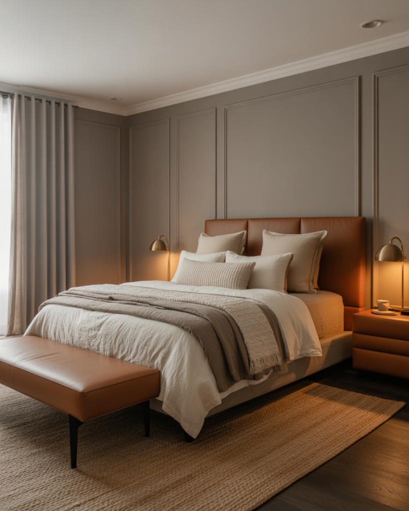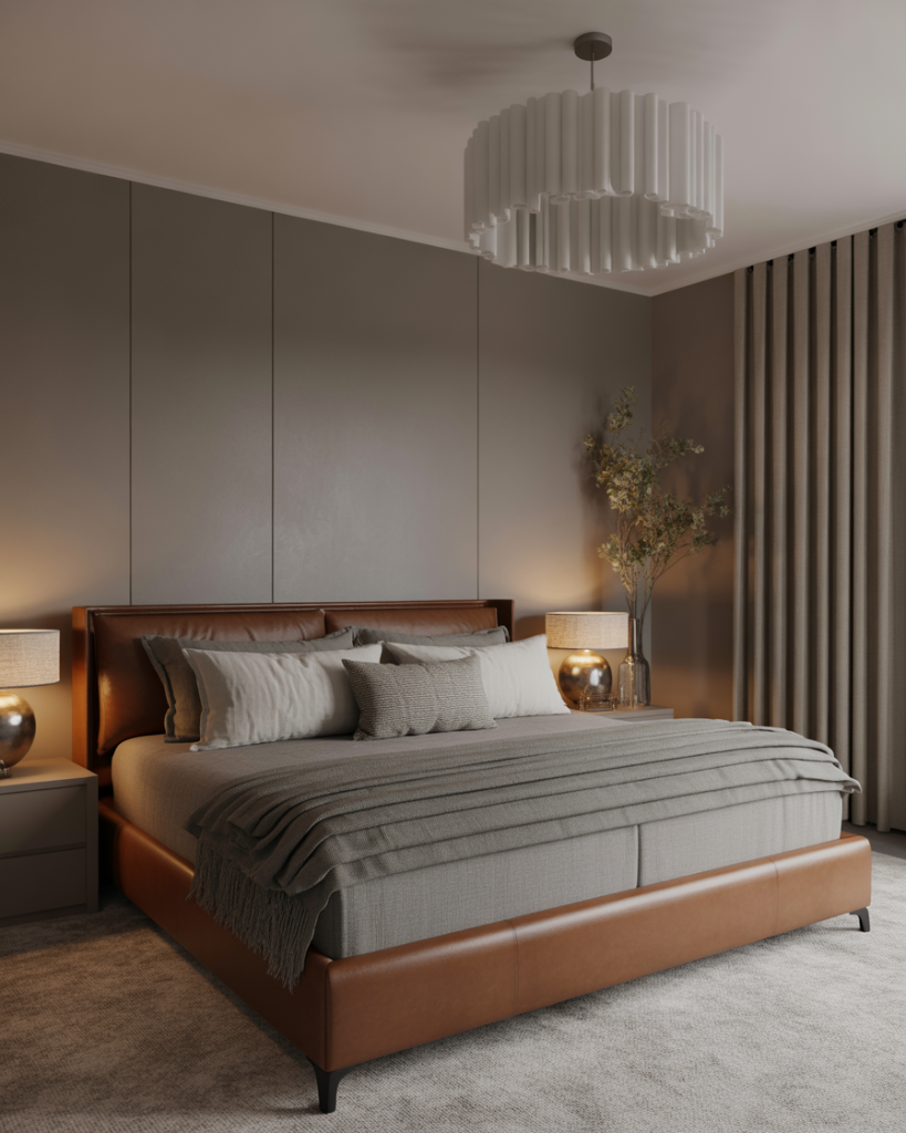 Pairing grey with brown turns a cool palette into a cozy one. Stone-grey walls, caramel leather, wool blankets, and wood furniture create depth without bright color. It’s a perfect balance for people who like neutral spaces but still want warmth. Works especially well in colder climates—or in rooms with weak sunlight.