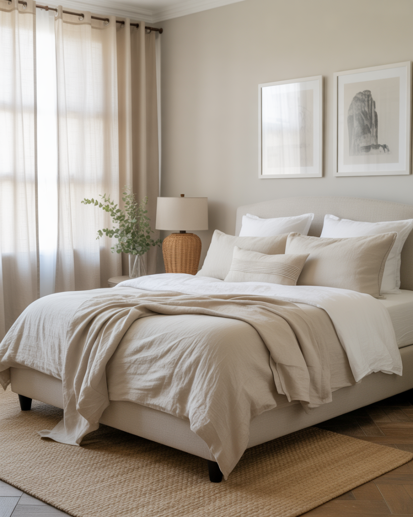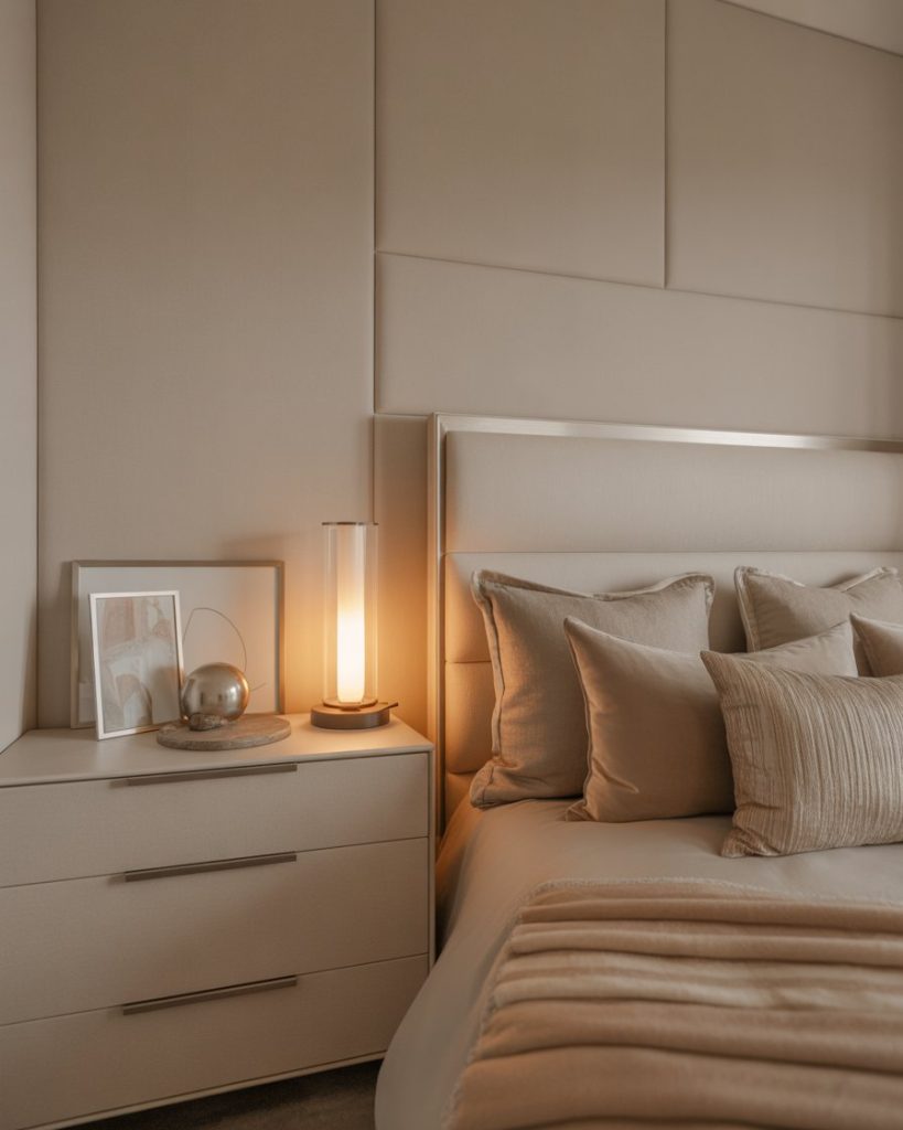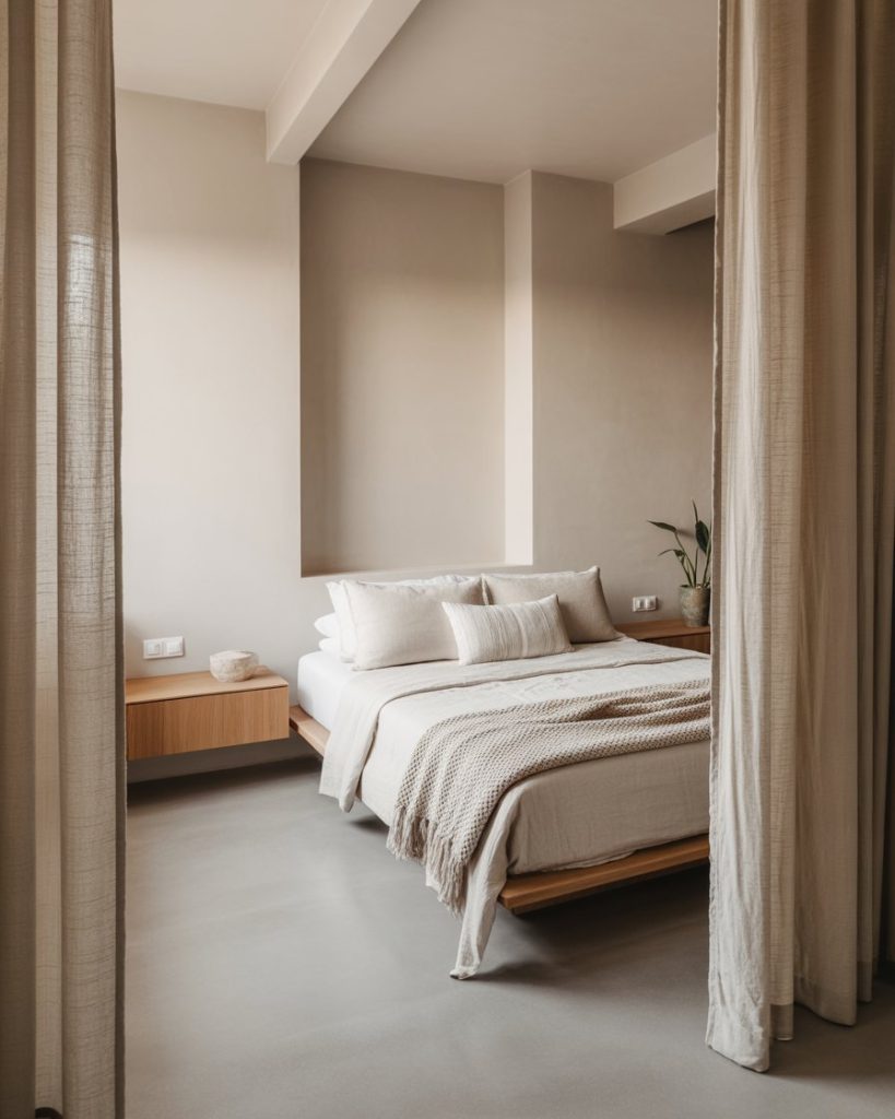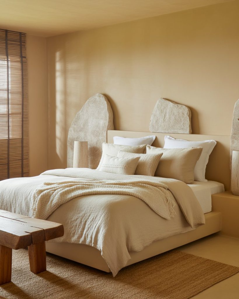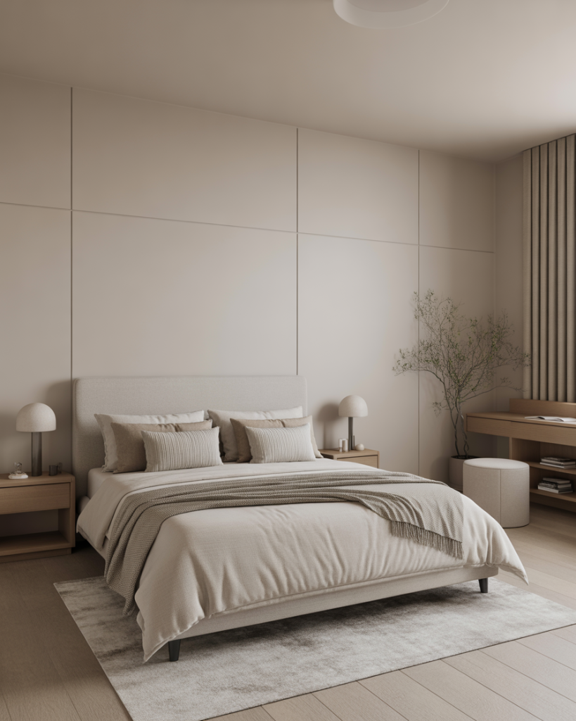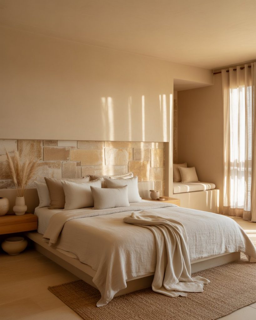A bedroom inspired by spa interiors uses soft beige, tactile linens, and natural stone accents to create instant calm. Perfect for anyone craving a wellness-first space where screens stay hidden, lighting is dimmable, and the air feels clearer. This trend suits people who come home to recharge, not perform.