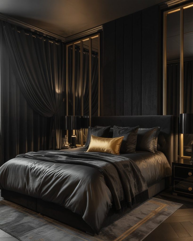 A lover of bold contrast, black walls, and brass fixtures, a bedroom with this setting is a private speakeasy. This atmosphere is lively with sculptural lighting, sumptuous curtains, and rich bedding. This is ideal for those who love nighttimeand for urban apartment owners who want elegance with a bold finish.