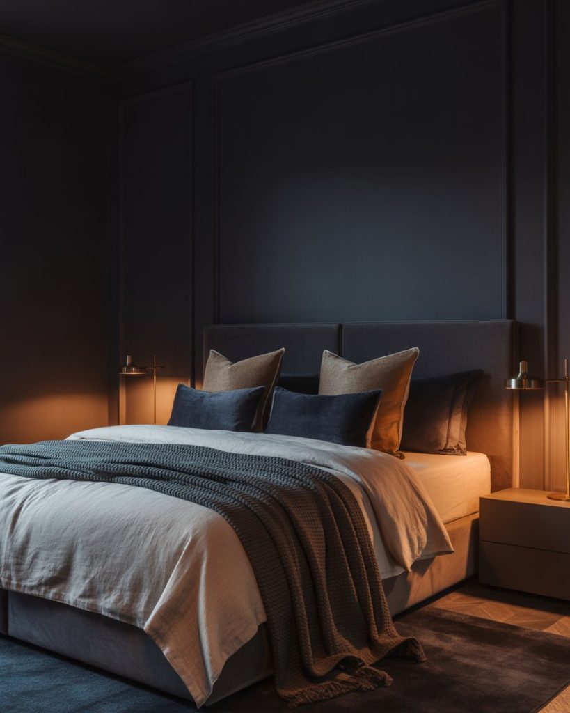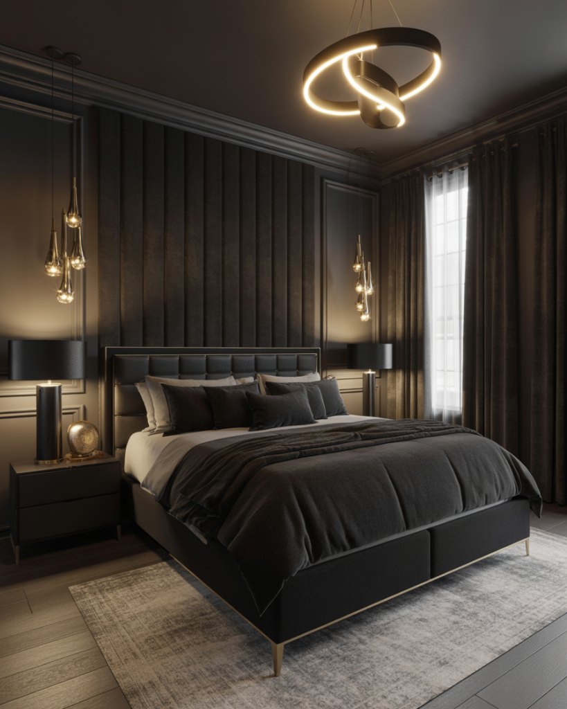 A dark, moody master bedroom sets the stage for deep rest. Matte charcoal walls, plush bedding, and soft lamps create a cocoon effect without feeling heavy. Add velvet throws or ribbed rugs for tactile comfort. This look is ideal for people who prefer dim light, slower evenings, and quiet spaces that almost “shut the world out.” A perfect choice for night owls and deep sleepers.