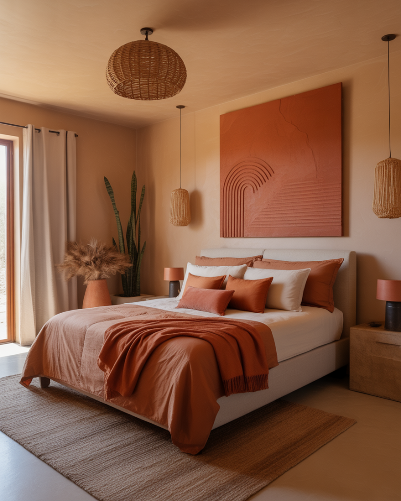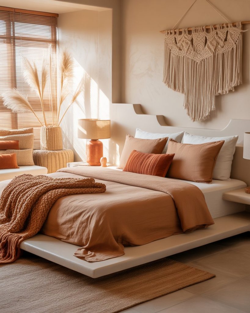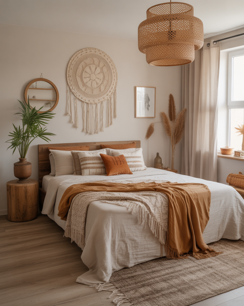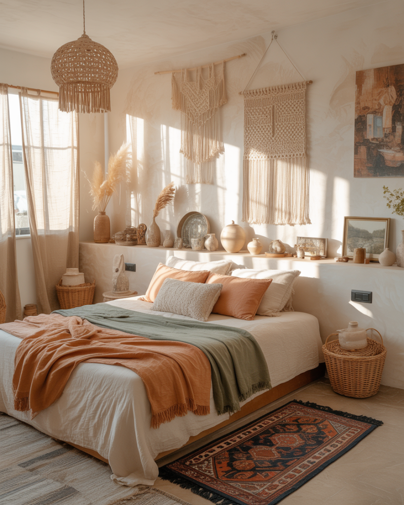 The relaxing boho style mixes patterns, handmade decor, and earthy tones for a space that feels collected, not staged. Layered rugs, woven lamps, and vintage textiles tell stories. This is the bedroom of the traveler, the artist, and the memory-keeper. Nothing has to match perfectly—only feel right. Cozy, soulful, and soft on the eyes and heart.