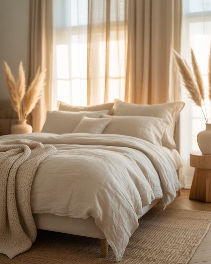 Linen bedding and slipcovers draped over your furniture with curtains can also create a lived-in charm. This is ideal for warm, humid climates or for those who appreciate the softness of linen over patterned textiles.