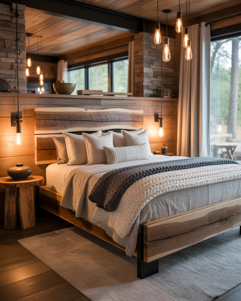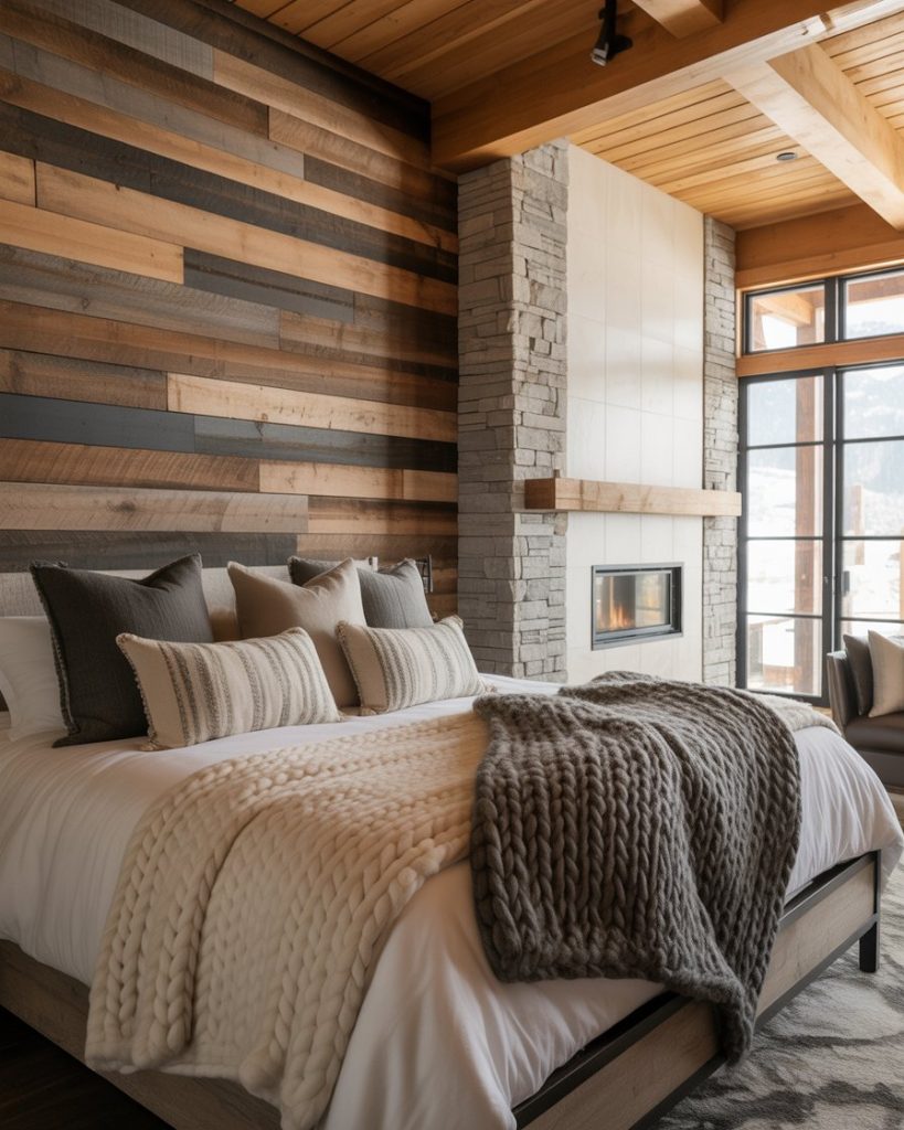 This look mixes stone, reclaimed wood, and heavy knit blankets but keeps the layout sleek. Less farmhouse, more refined cabin. Works great for colder regions or anyone who wants a cozy winter escape vibe all year.