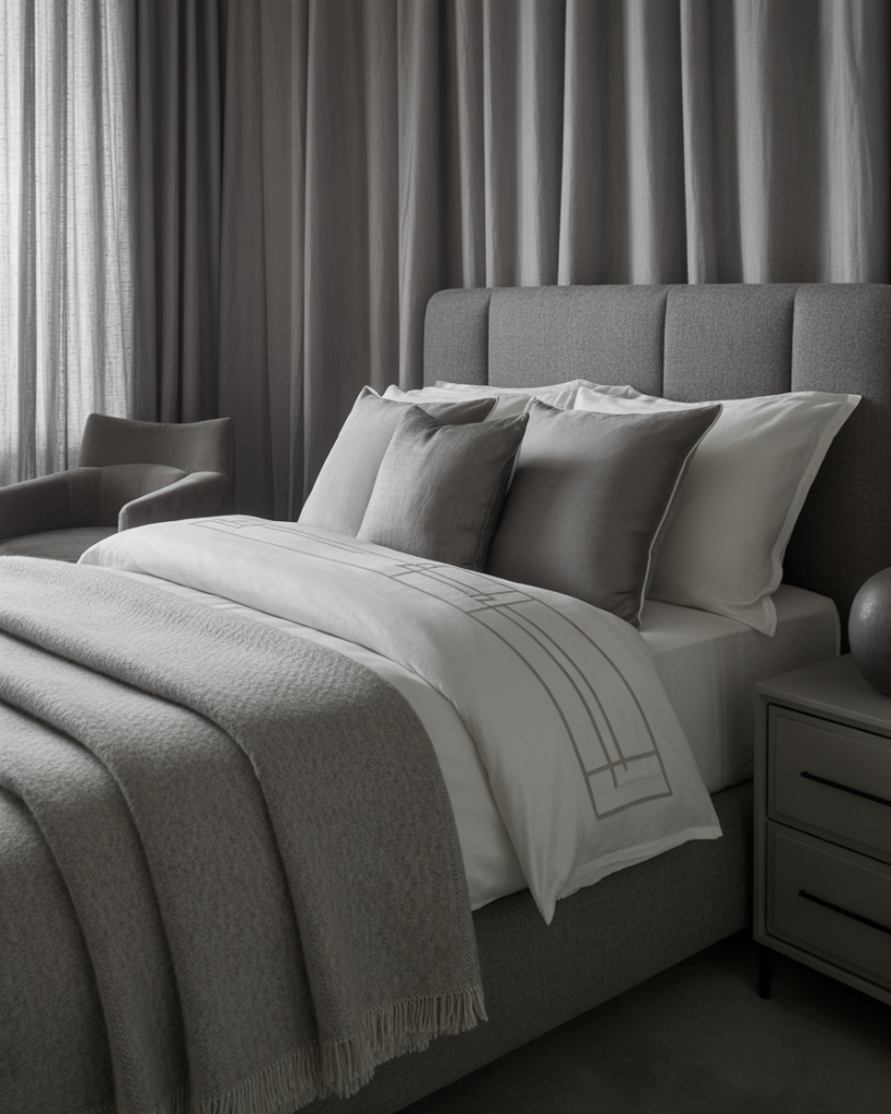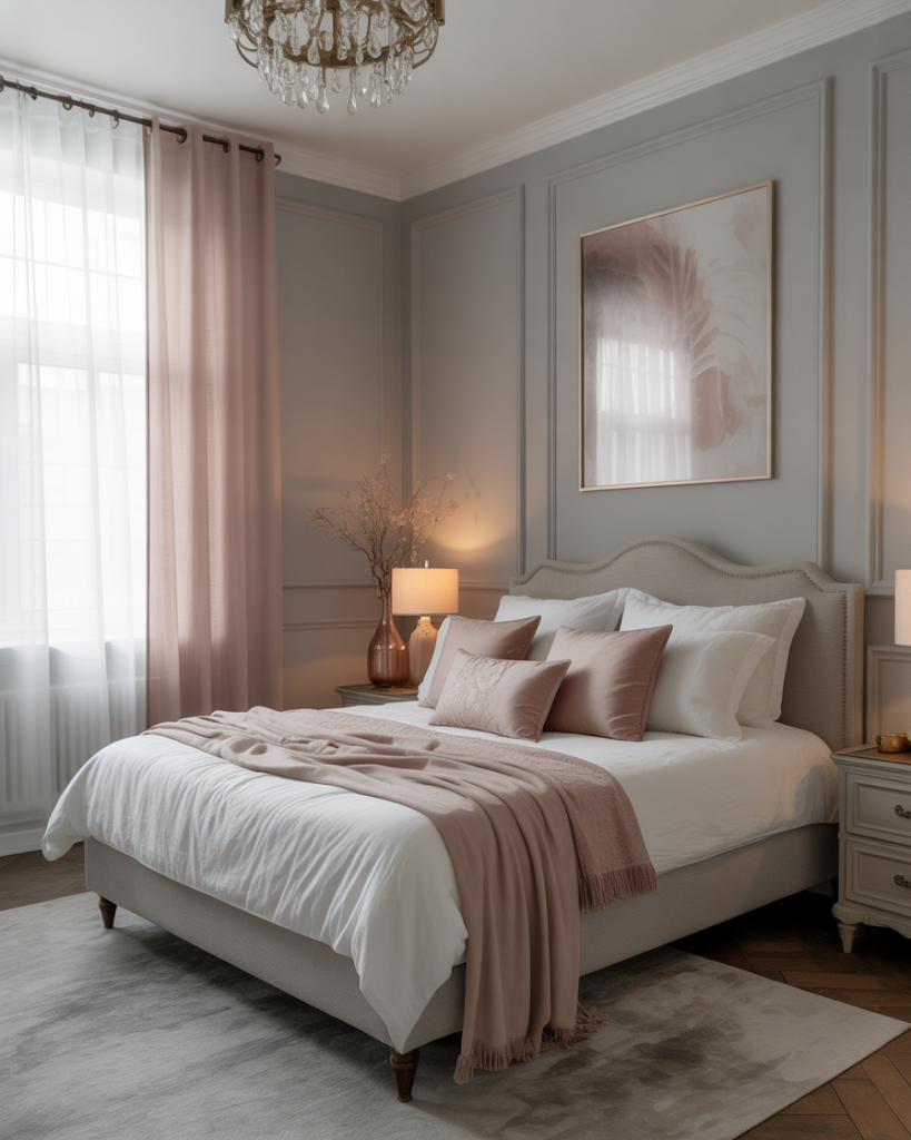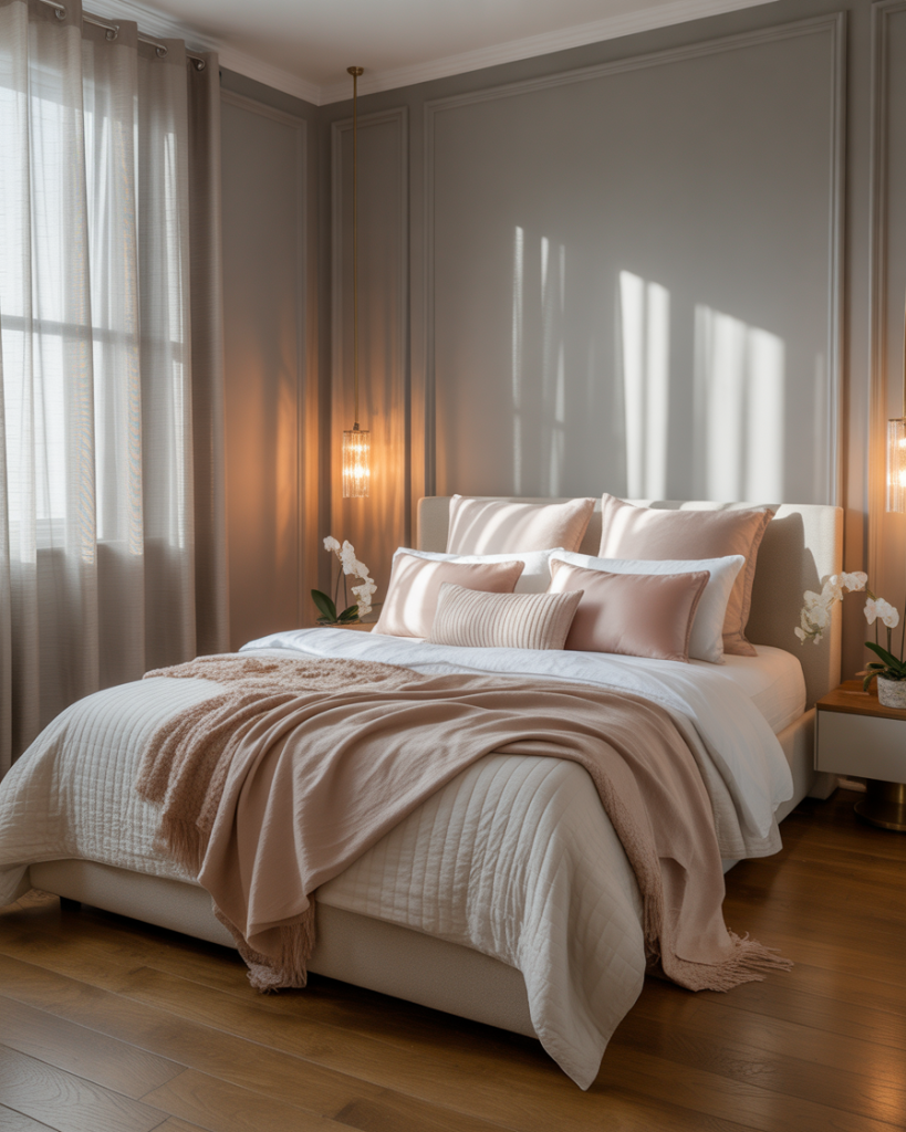 A romantic bedroom doesn’t have to be pink—gray walls make the perfect soft backdrop. Add blush pillows, sheer curtains, candles, and curved furniture to create warmth without sweetness. The palette stays mature, stylish, and welcoming for couples. This look is perfect if you like elegance without clutter, intimacy without darkness, and décor that ages gracefully.