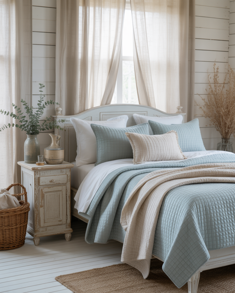 A gentle cottage style with soft blue undertones brings a lived-in charm that feels like a slow Sunday morning. Whitewashed wood, simple quilts, and natural fabrics give the room a relaxed rhythm. Instead of polished perfection, the goal is comfort with character—handmade decor, woven baskets, and framed memories. Great for those who love the feeling of a vacation cabin without leaving town.