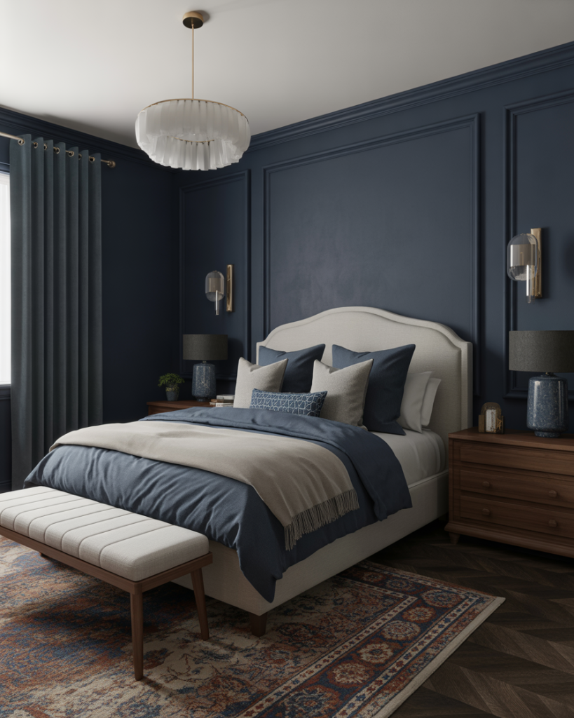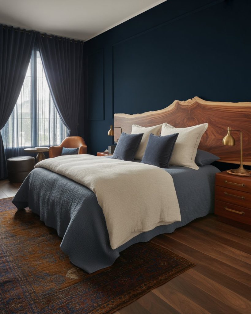 Deep navy brings instant luxury without needing marble or gold. It works brilliantly with walnut furniture, brass hardware, and crisp bedding. Navy hides wear, making it ideal for families and pets. It’s bold but not loud—dramatic with a calm undertone. A smart pick for people who want contrast without going fully black.
