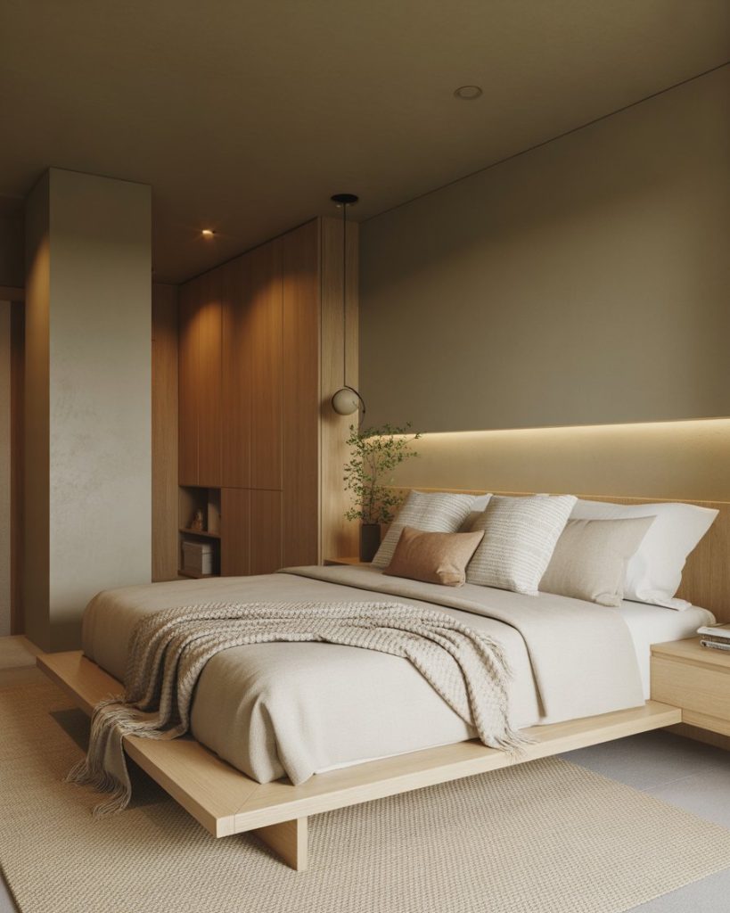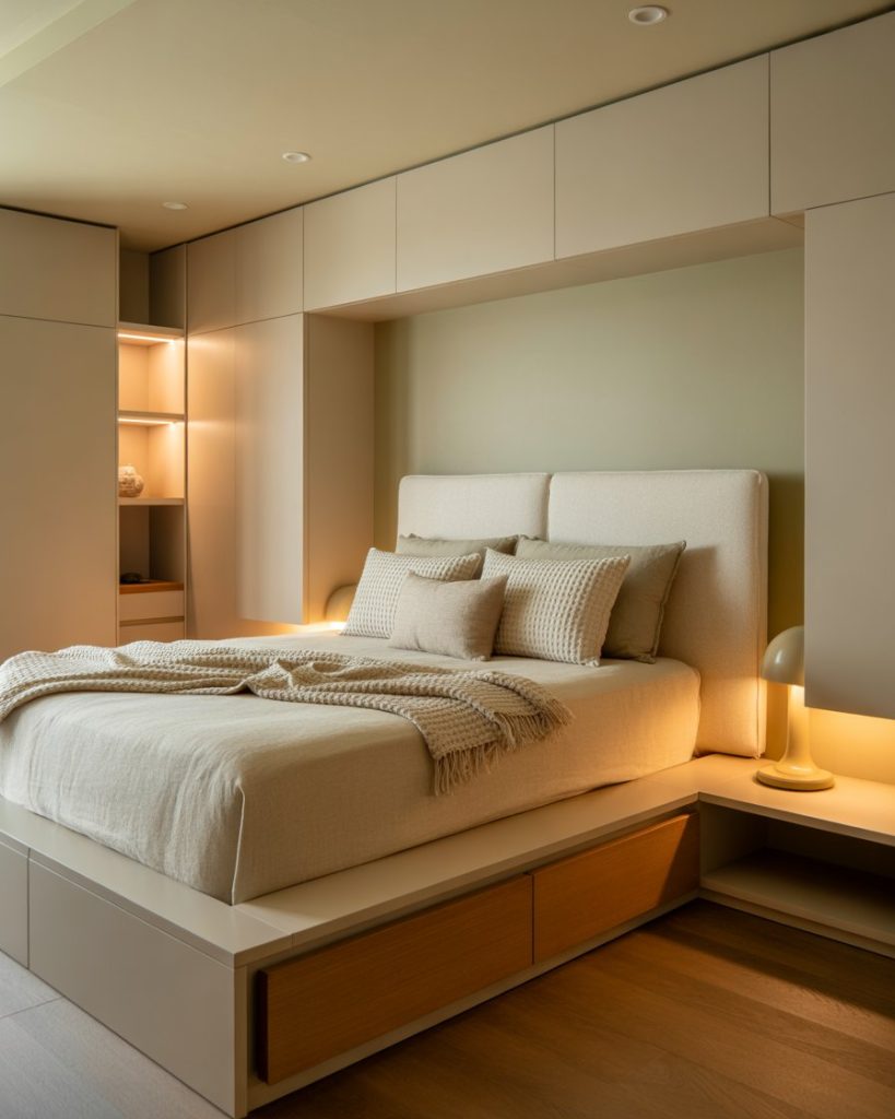 Even small rooms can feel cozy when furniture stays low, lighting stays warm, and clutter is removed through hidden storage. Wall sconces instead of table lamps free space, while neutral bedding keeps the room visually light. This layout is perfect for compact apartments where comfort still matters more than square footage.