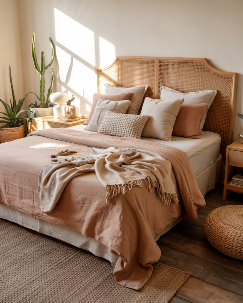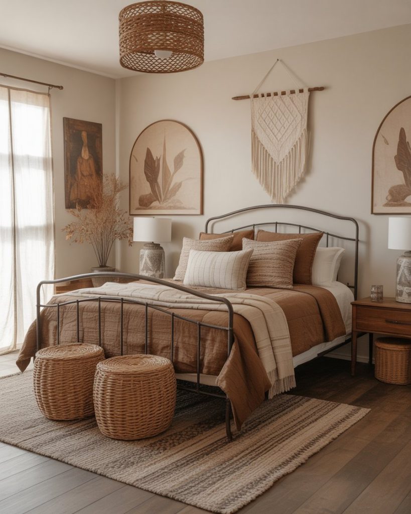 The western aesthetic evolves into “Desert Boho”—a fusion of sandy neutrals, brown clay tones, and handcrafted pottery. Woven jute, terracotta planters, and cane accents bring organic warmth. This simple yet refined design suits people who prefer minimal clutter but crave sensory texture. Dried palms and layered rugs tie the space together with quiet earthiness.