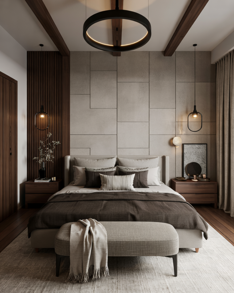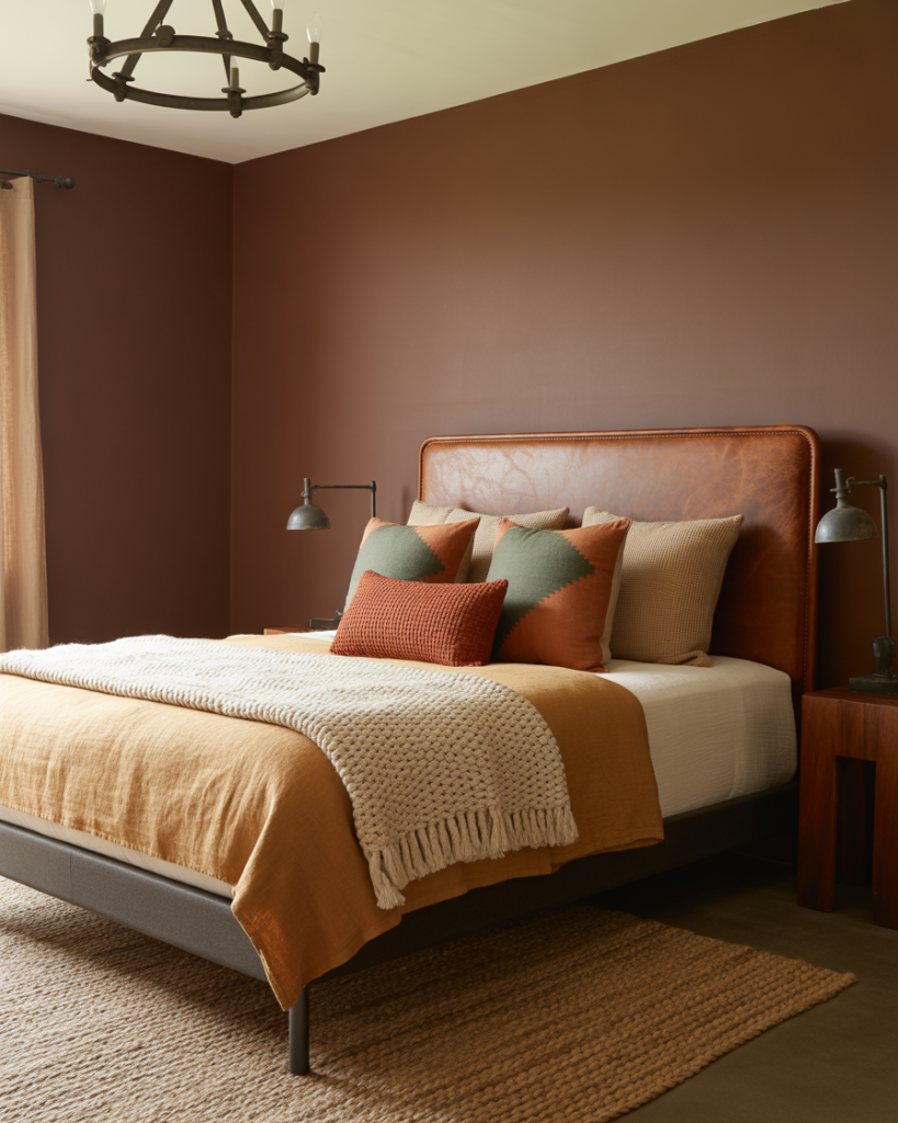 The 2026 trend of earthy minimalism brings brown back in sophisticated tones—espresso, walnut, and cinnamon. Paired with black hardware and stone textures, it creates a warm modern cocoon. Clean lines, hidden storage, and subtle scent diffusers make the space soothing for couples who appreciate uncluttered harmony.
