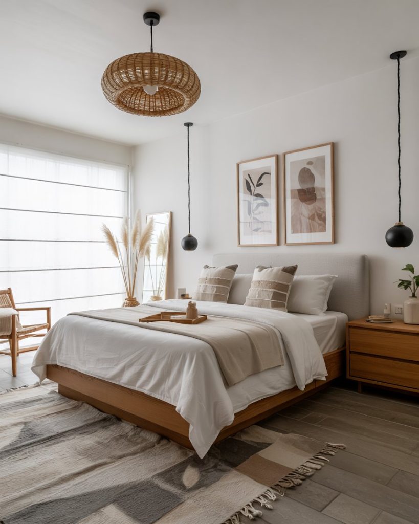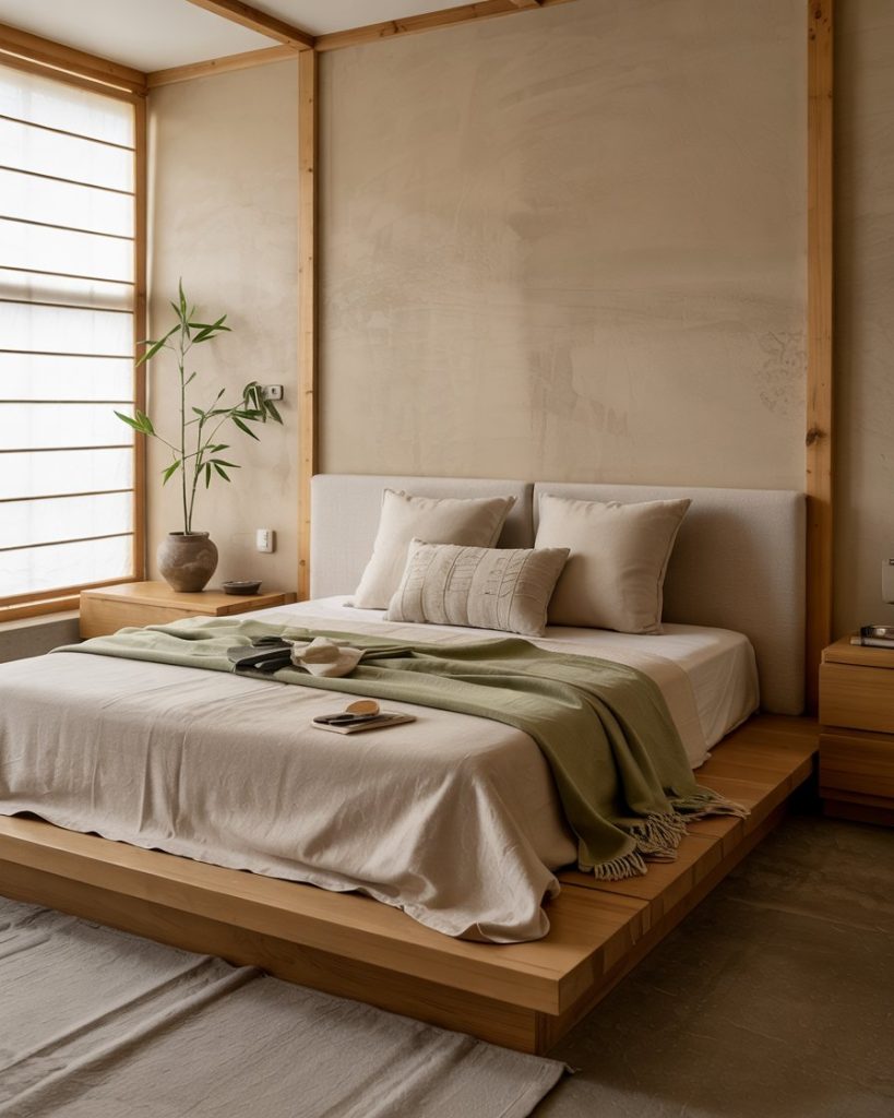 Tatami mats along with light woods and soft clay walls keep the room restful while avoiding severity. Hidden storage and a low futon-style bed foster seamless flow. Little details like bonsai plants and linen bedding capture natural imperfection. This style resonates with the daily meditative routines and a touch of muted mindfulness.