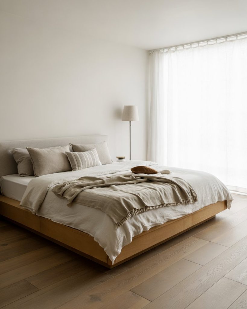 The Scandinavian look continues to dominate modern master bedrooms in 2026 with its light white tones, pale oak, and layered textiles. A focus on functional beauty keeps the room peaceful rather than empty. Pair neutral walls with linen drapes, wool rugs, and matte black lamps for quiet contrast. This approach works especially well for smaller urban spaces that crave daylight and calm. Add a touch of nature with a single potted olive tree or dried bouquet to soften the geometry of the furniture.