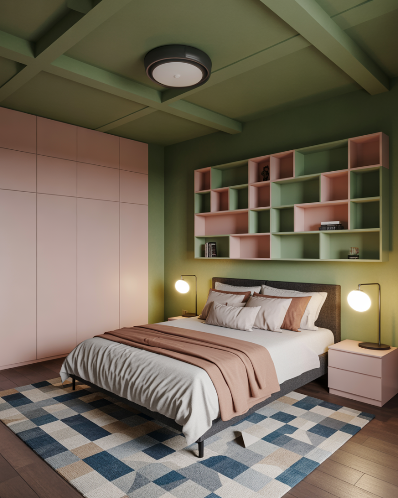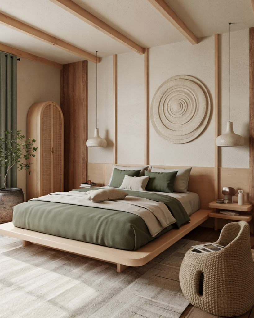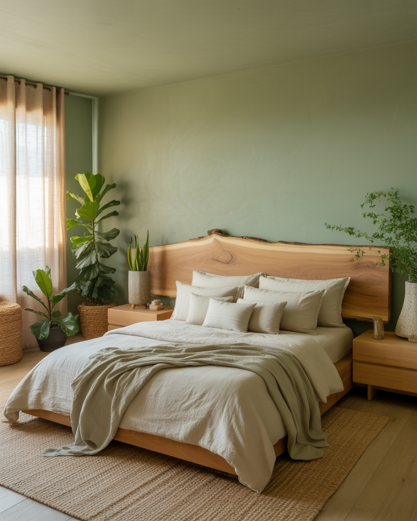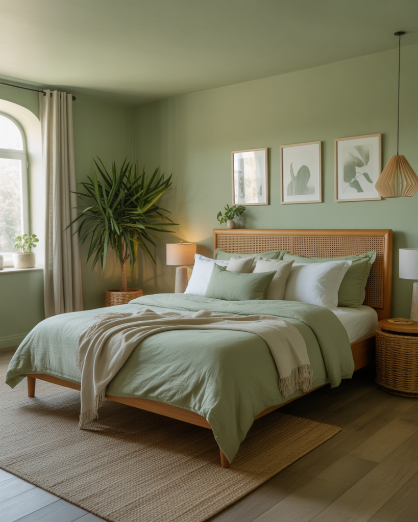 Shades of green like sage, eucalyptus, and olive reduce visual stress and create spa-like calm. Natural wood, woven baskets, and linen bedding make the room feel like a forest cabin, even in the suburbs. Designers like Justina Blakeney prove that color is emotional therapy, not just paint.