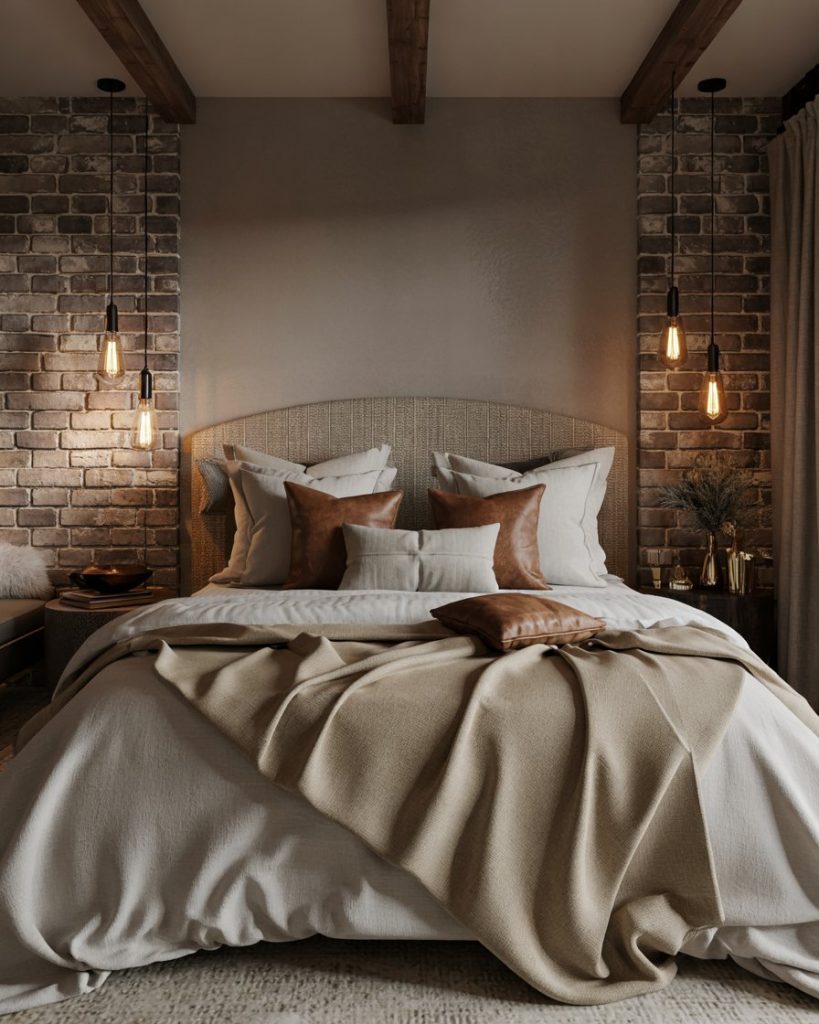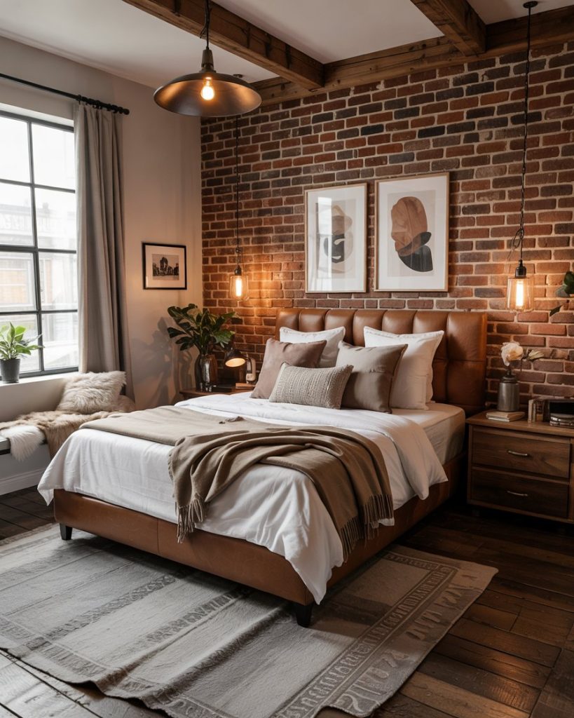 Exposed beams, concrete, and metal may sound like a cold combination, but in 2026, designers pair them with soft textiles and layered lighting. Transformative elements like woven rugs, linen throws, and warm LED strips turn a rough shell into a retreat. To take the softened look even further, incorporate reclaimed brown leather or rust-hued accents. Industrial bedrooms now have a romantic softness rather than a rigid feel, a perfect juxtaposition for urban character lovers.