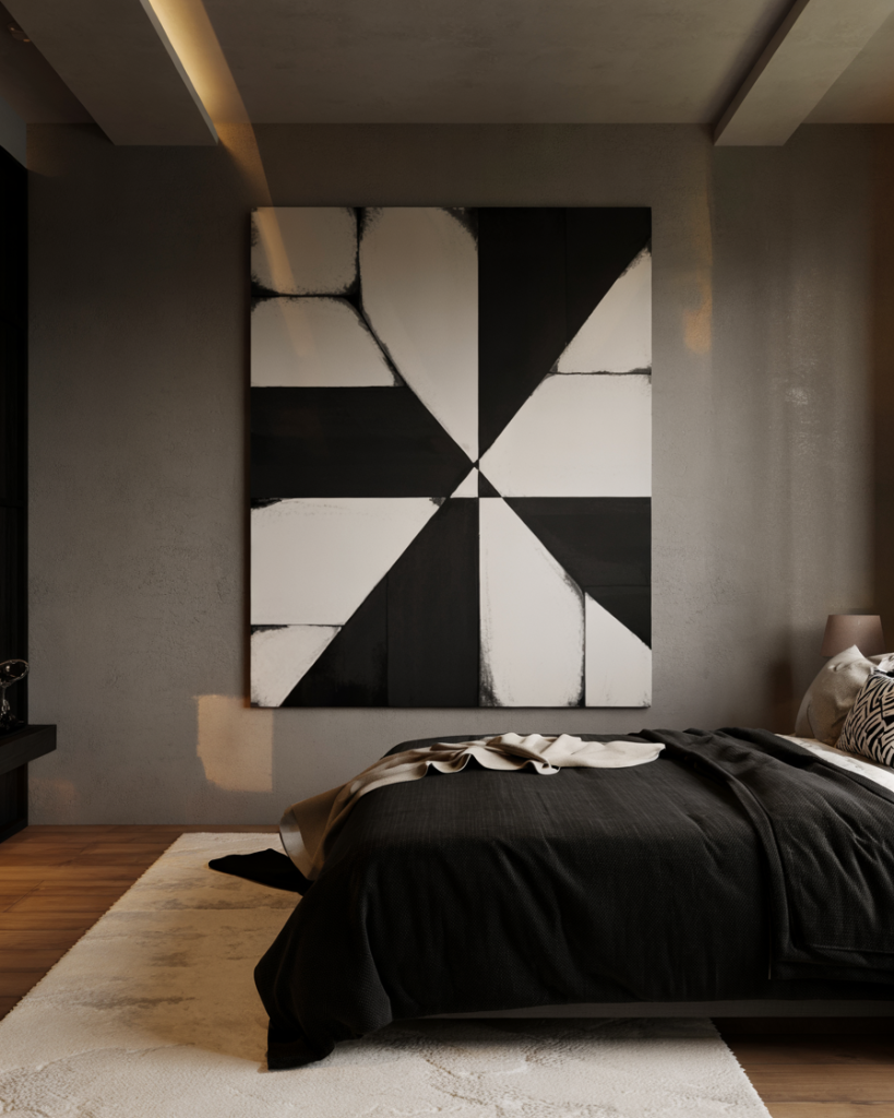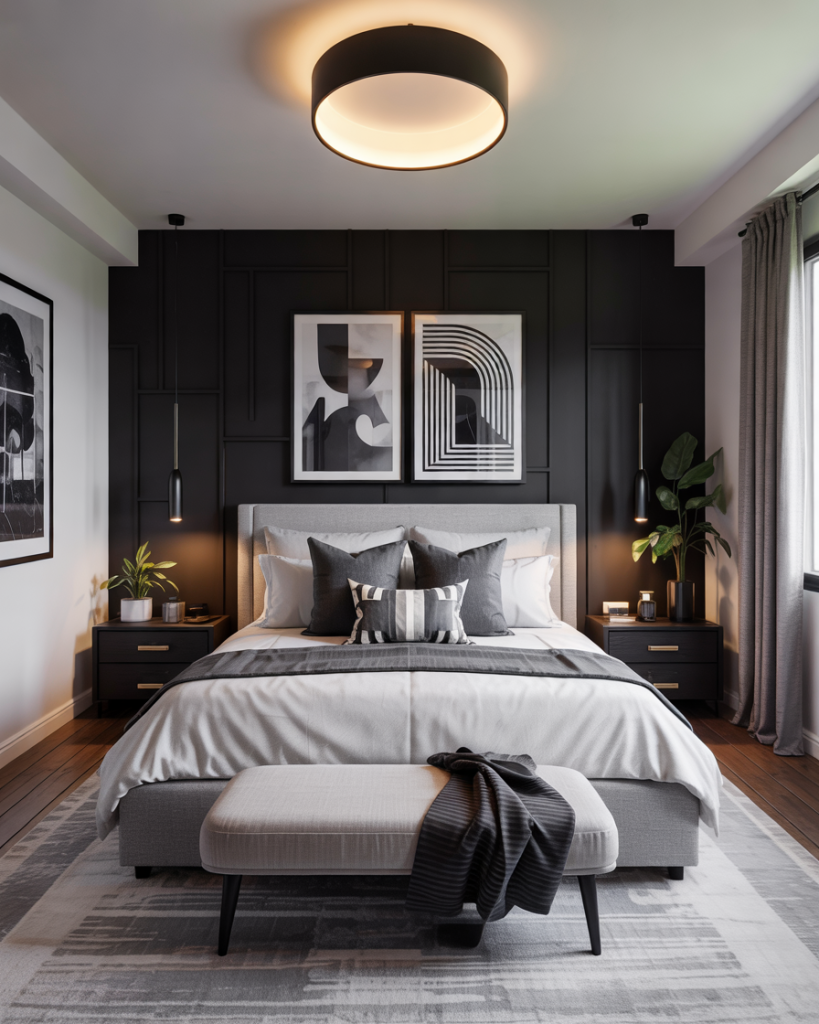 For lovers of visual contrast, a black and white master bedroom makes a confident 2026 comeback. The secret is proportion—70% white, 30% black—to keep it bright, not harsh. A soft rug and warm wood floors prevent coldness. Add geometric art or monochrome photography for edge, then balance it with cozy fabrics and indirect lighting.