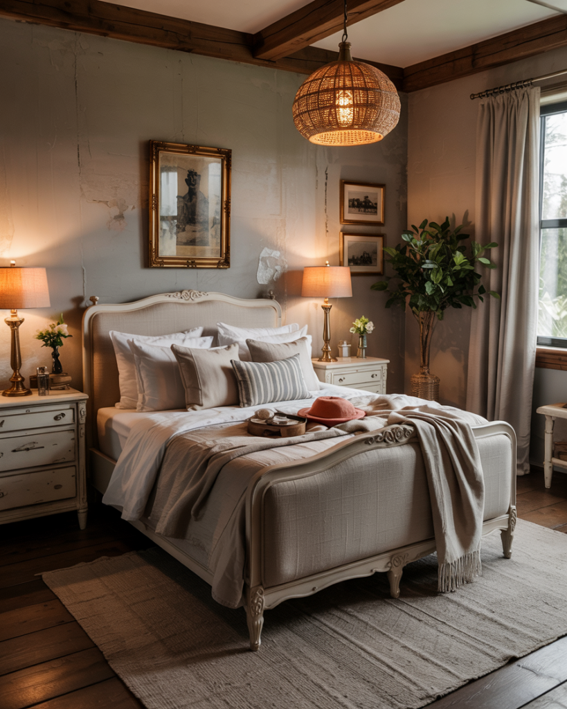 A vintage master bedroom mixes aged wood, iron bed frames, floral quilts, and antique mirrors. Soft candlelight and neutral paint make it feel more nostalgic than old-fashioned. It’s perfect for farmhouse homes or anyone craving authenticity over gloss. Pair aged pine furniture with linen curtains and ceramic lamps for a collected, lived-in mood that feels inherited yet fresh.