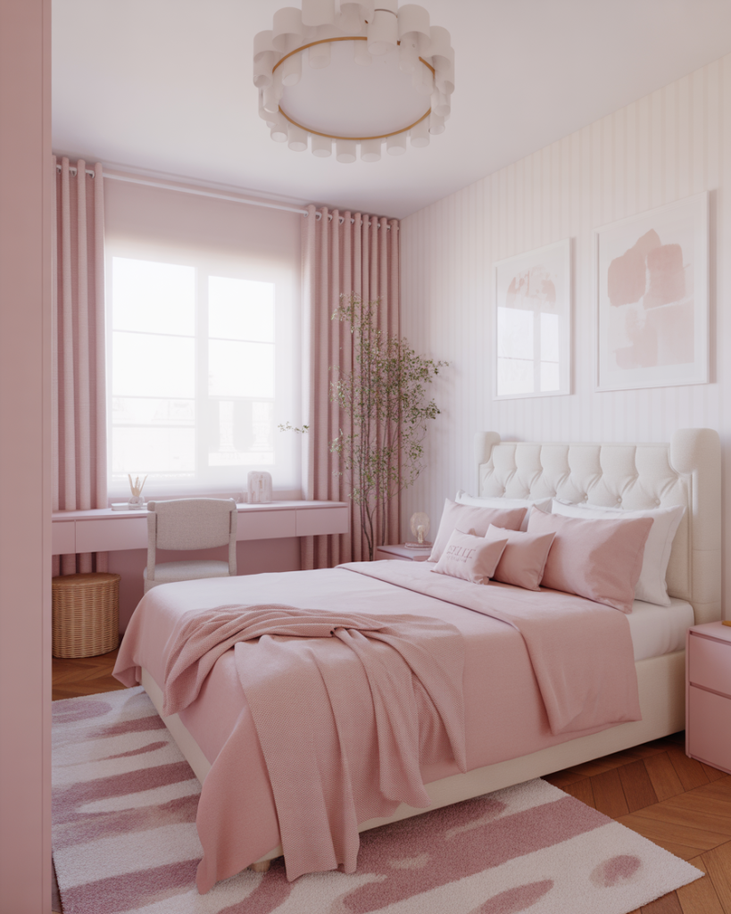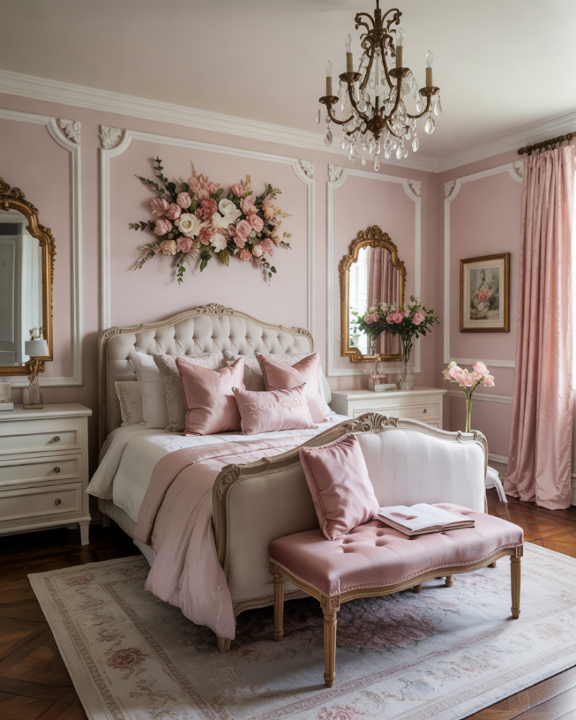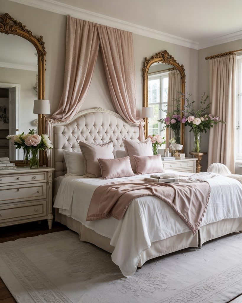For the pink, cream, and white palettes of softness and detailed romance, freshly blooming and flowing drapes are made with carved moldings and tufted headboards. To avoid excessive sweetness, modern lighting will hang with vintage gold mirrors. The space is made graceful and fussy without feeling draped. This look is made for those who celebrate romance and timeless elegance with a fondness for soft drama.