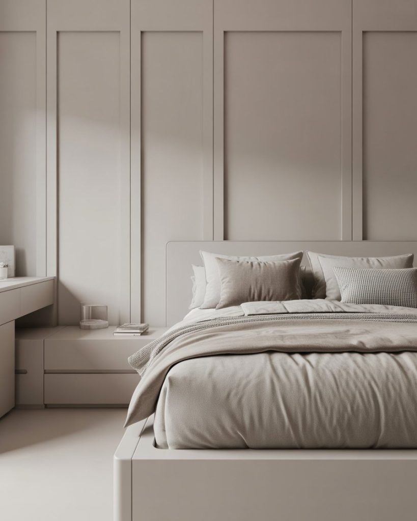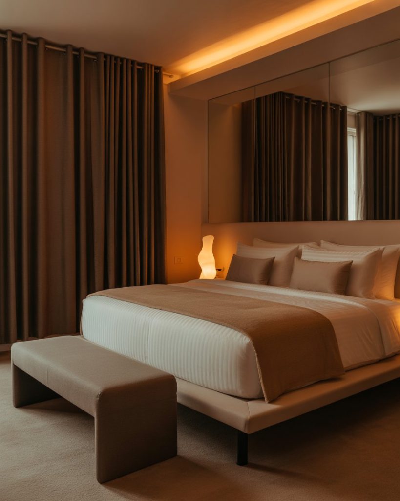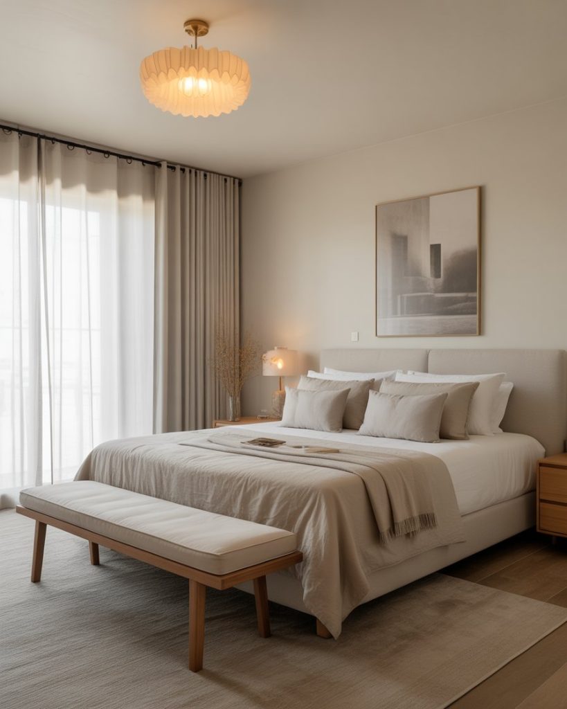 A master that also serves as a guest space works best with an aesthetic hotel-like setup: layered bedding, extra pillows, blackout curtains, and a bench for luggage. You keep your comfort, but visitors feel welcomed without stepping into someone’s private zone. A calm color palette keeps the room flexible for everyday life and occasional hosting.