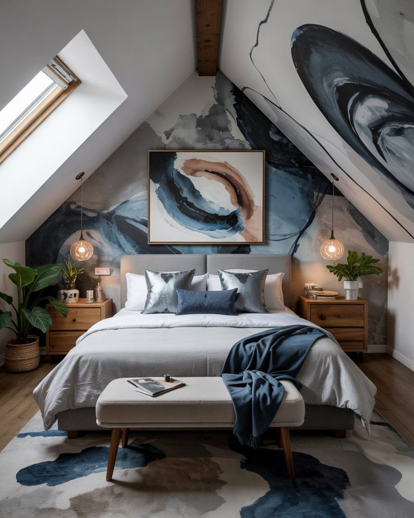 An attic converted into a master suite celebrates boldness and expression. Beams are no longer an annoyance, and skylights embrace morning and evening sunlight. Add a few abstract paintings and fabrics in mismatched styles and a splash of grey or blue paint to the wall. This would suit the artistic homeowner best. This would inspire the creativity in the owner when they are asleep or trying to rest.