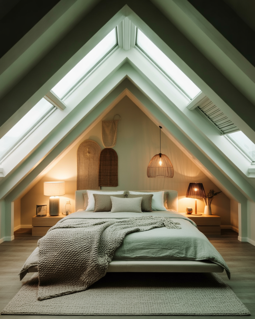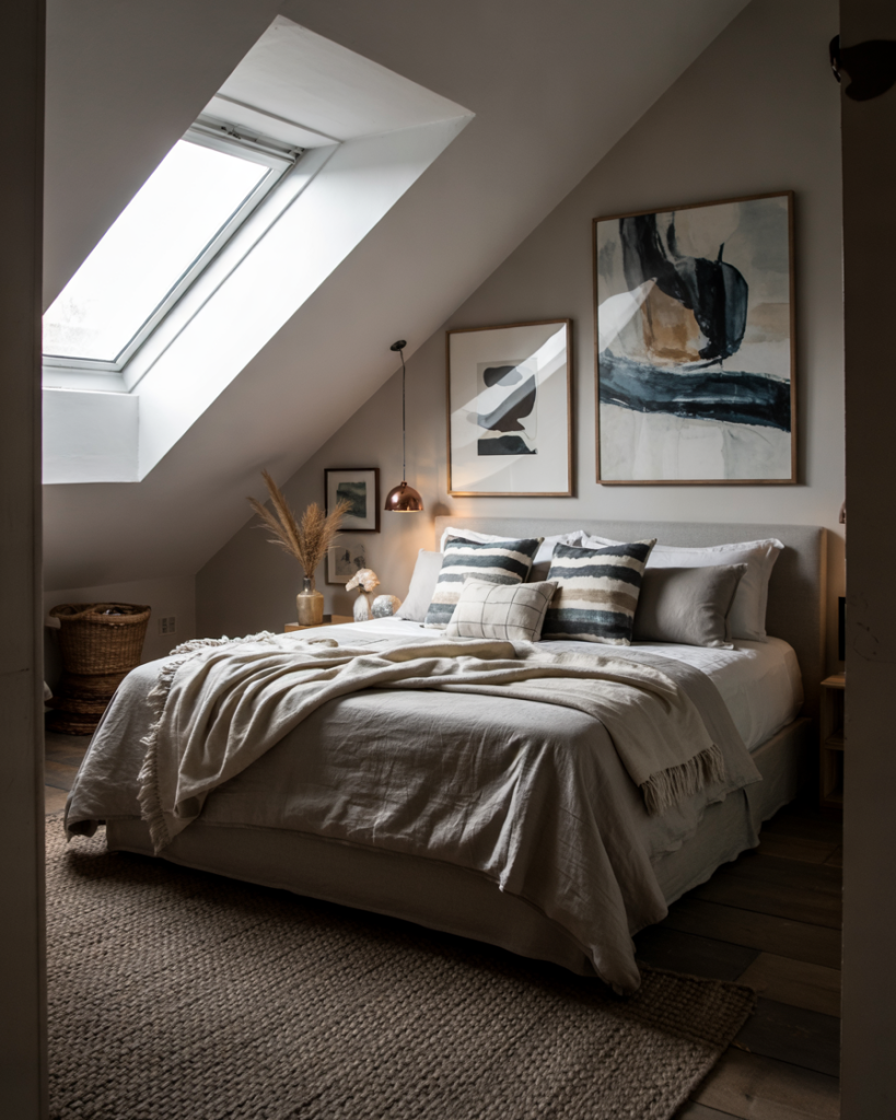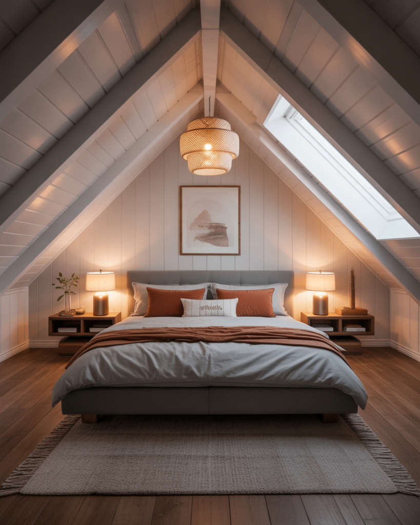 An attic bedroom feels magical when you embrace the slope instead of fighting it. Low beds, skylights, string lighting, and textured blankets turn the space into an adult treehouse. The angled ceiling gives instant character and works especially well for people who want a quiet escape from the rest of the house.