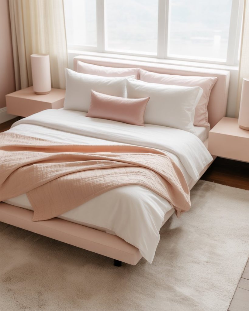 Despite the compact size, a master bedroom feels brighter and more spacious using a soft blush and white color palette, rather than bubble-gum pink. The pink is more sophisticated when paired with ribbed glass lamps and sheer curtains. Romantic, yet perfect for couples sharing a small space.