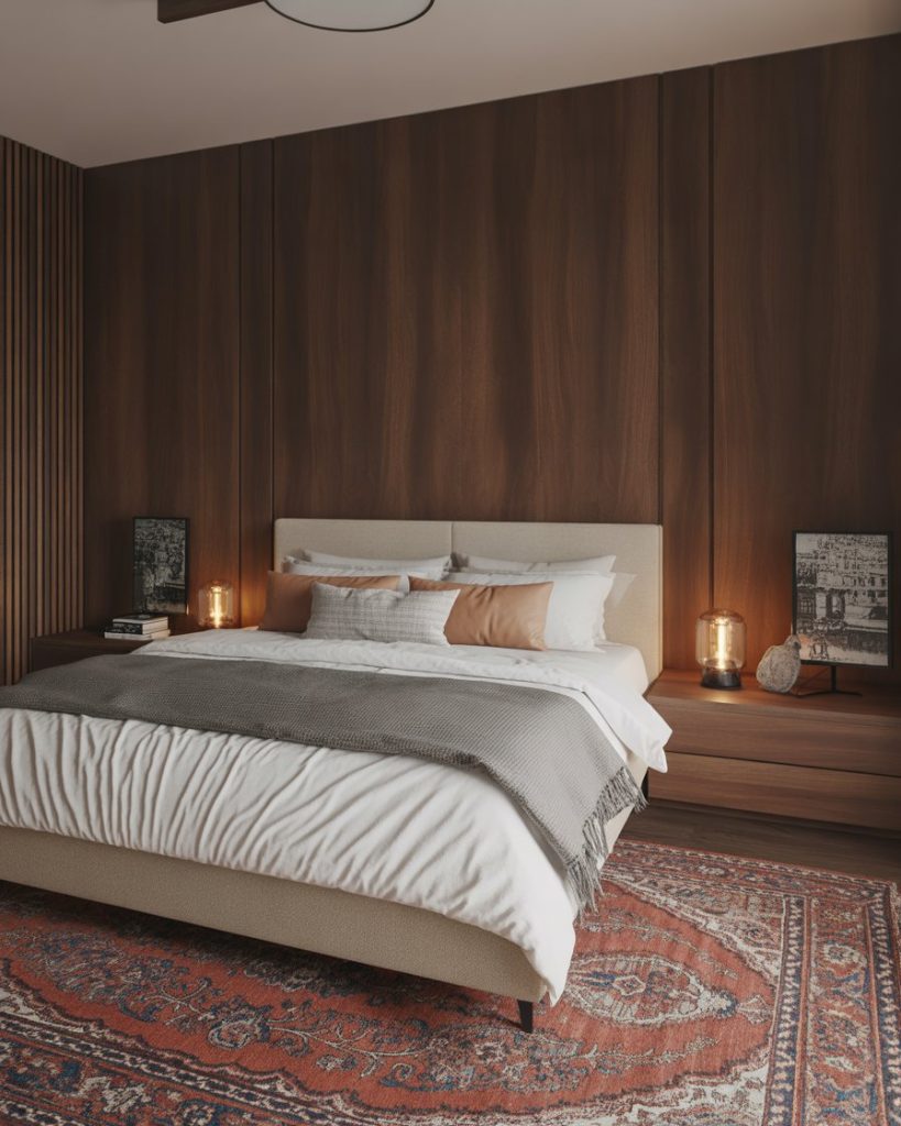 A modern low bed against dark walnut or oak panels plus a vintage rug creates a timeless primary suite. This mix feels collected instead of matchy, giving depth and history to a newer home. The warm tones age well, making it a style that won’t expire with trends.