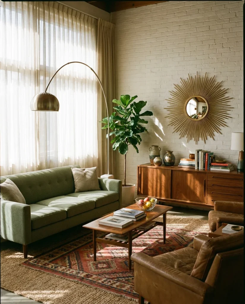 The walls in a retro mid-century modern living room deserve just as much attention as the furniture. Sunburst mirrors, atomic-era clocks, and geometric art prints are all making a major comeback in 2026 — and they punch well above their price point in terms of visual impact. A large brass sunburst mirror above a credenza or fireplace immediately signals the era without any explanation needed. These pieces work because they introduce rhythm and shape to a room that might otherwise feel too flat or symmetrical.