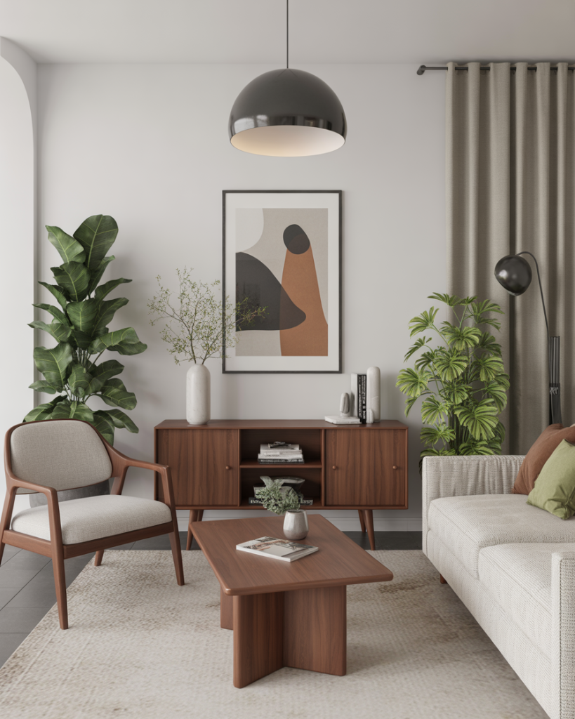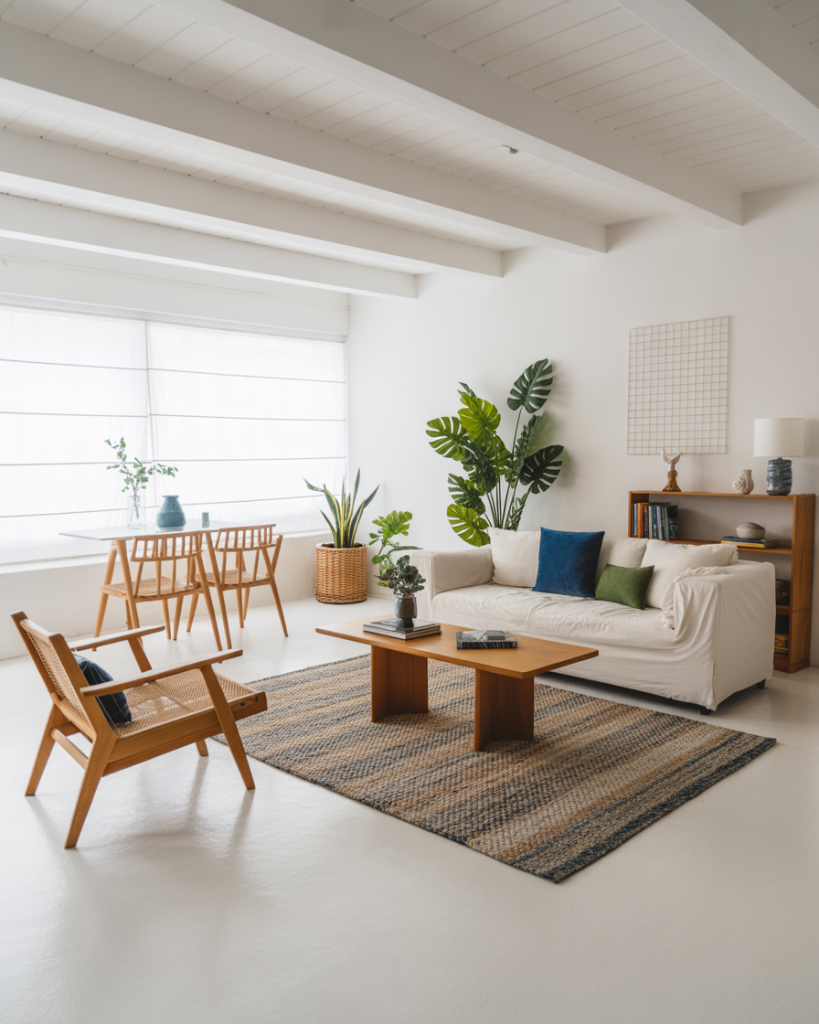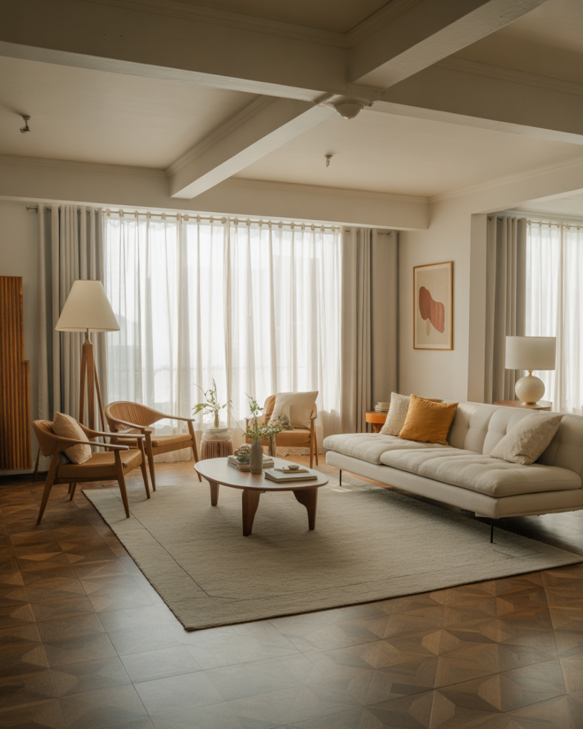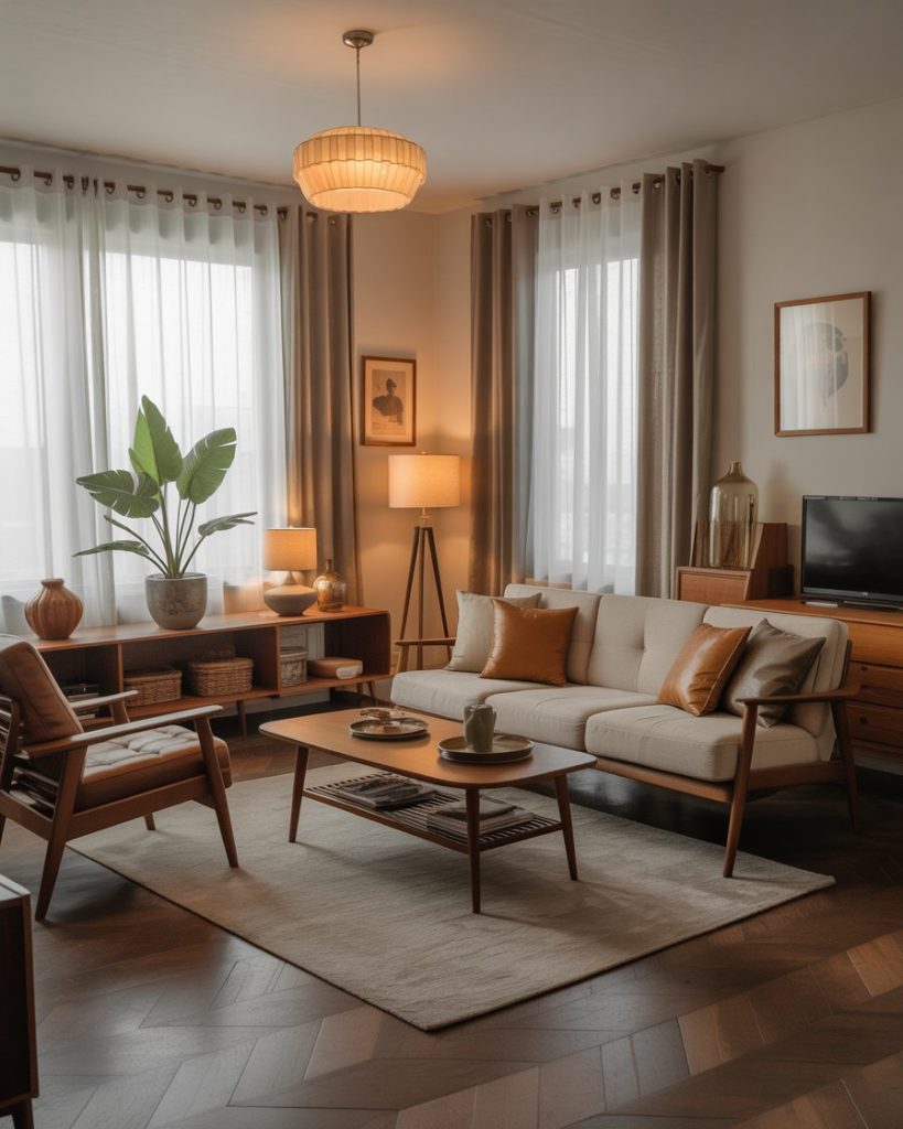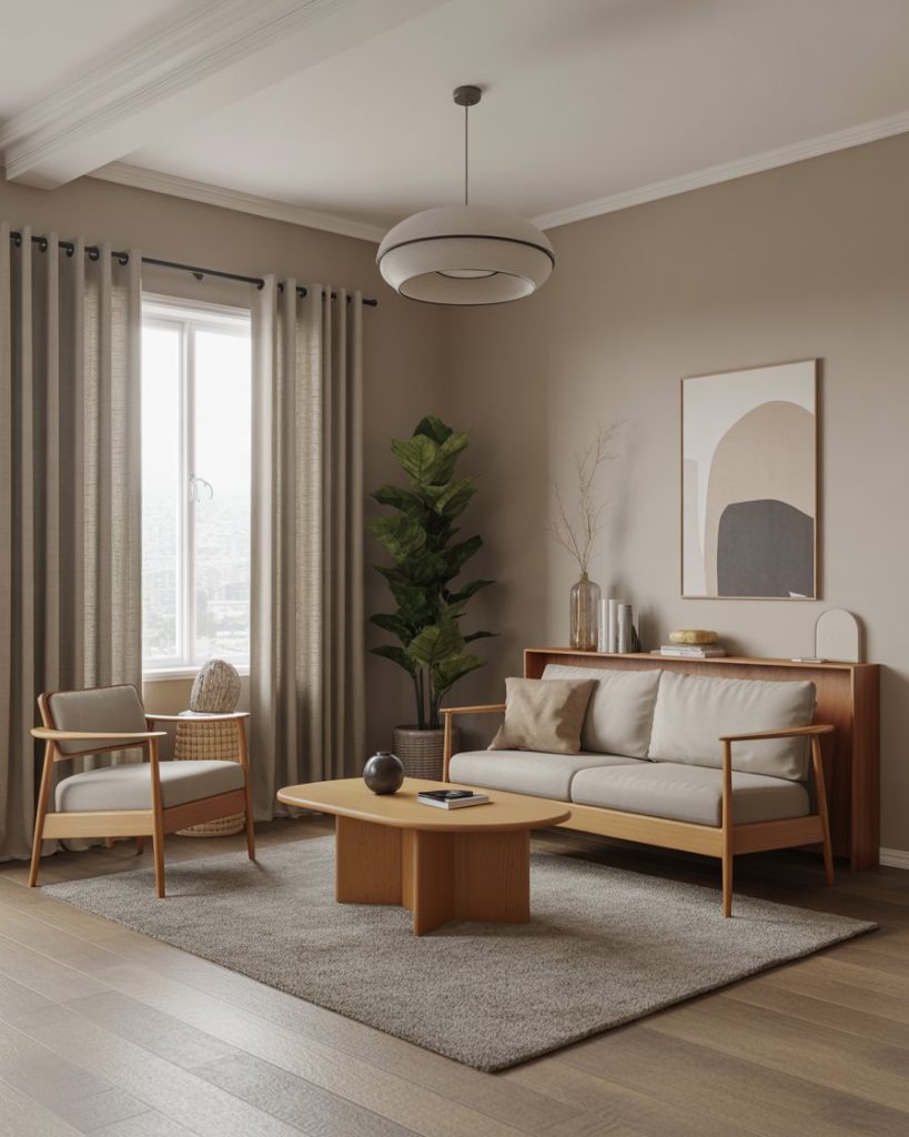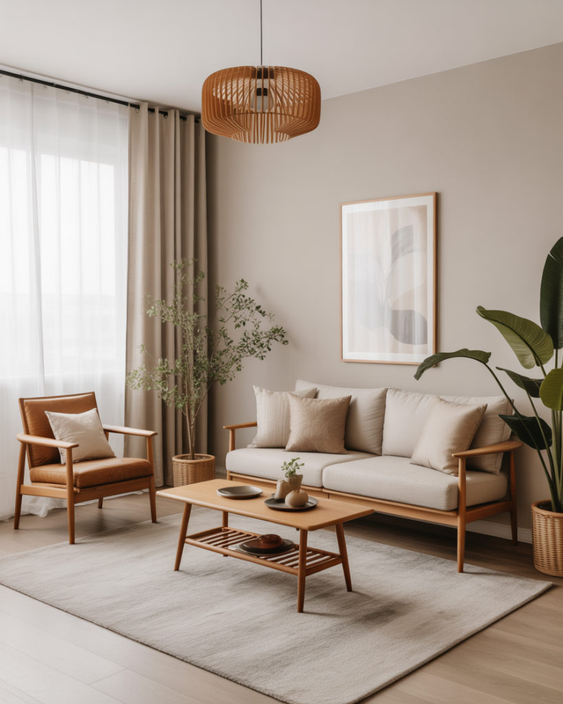 Blending Japandi serenity with Mid-Century warmth. Light oak tables, linen curtains, and a neutral-toned area rug promote relaxation. That neat balance between minimalist orderliness and natural texture makes it a dream for modern-day apartments.