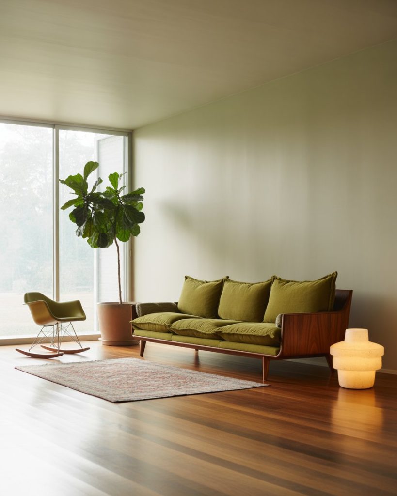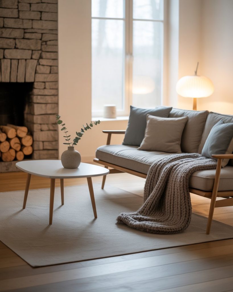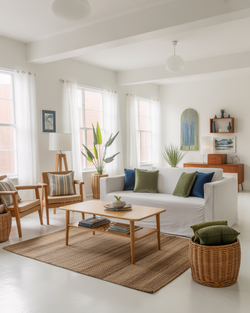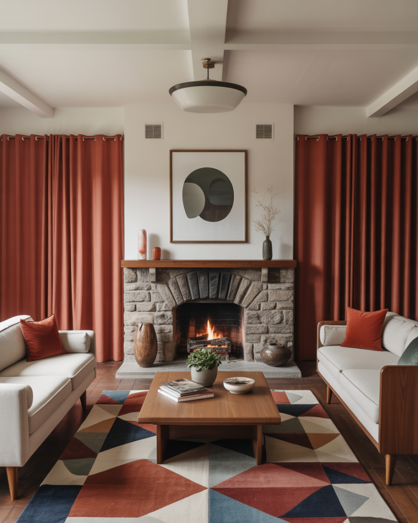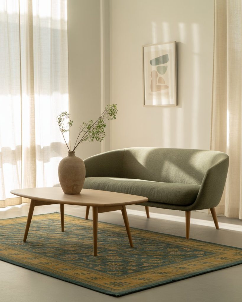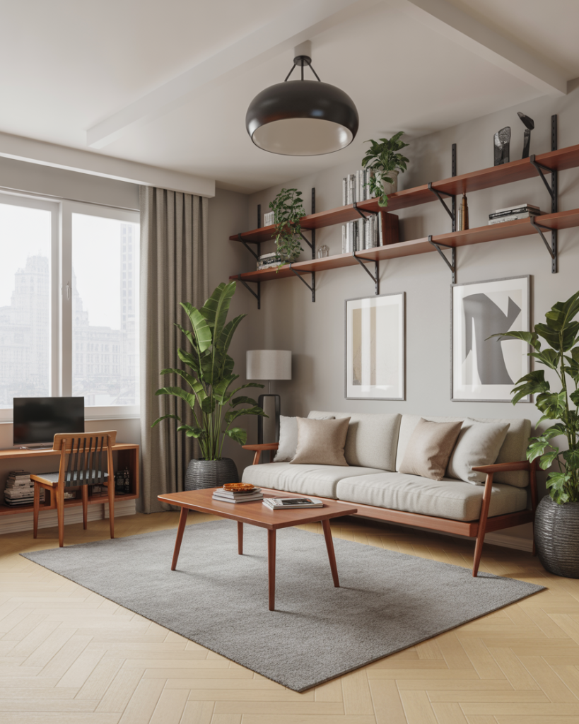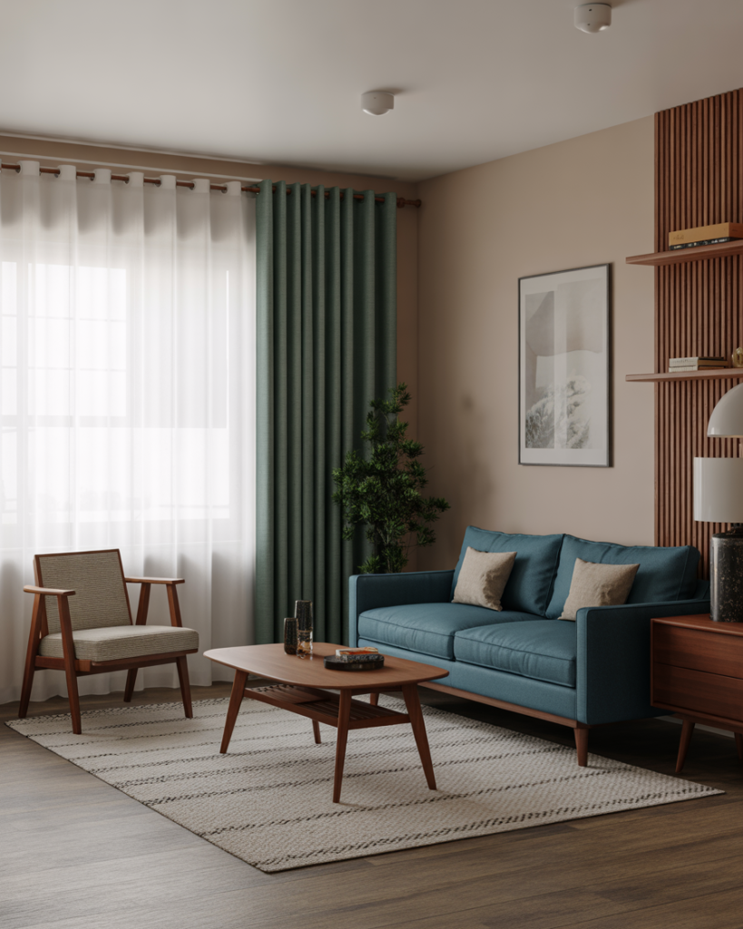 Blending Japandi serenity with Mid-Century warmth. Light oak tables, linen curtains, and a neutral-toned area rug promote relaxation. That neat balance between minimalist orderliness and natural texture makes it a dream for modern-day apartments.