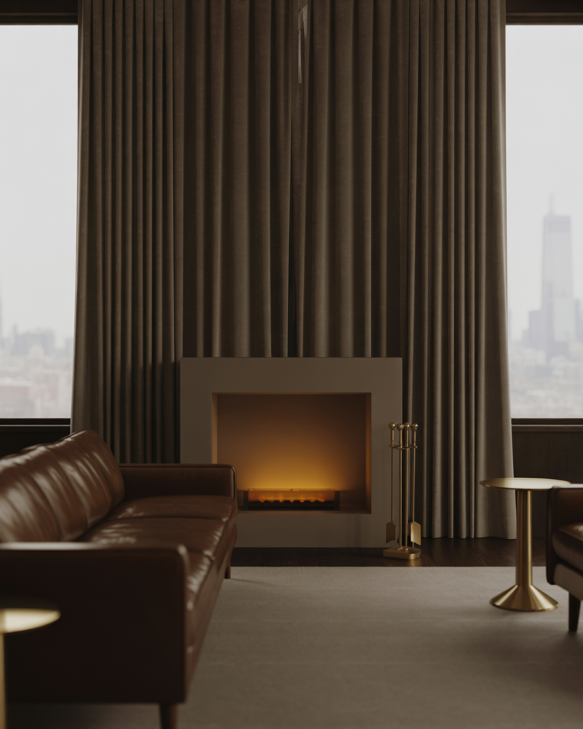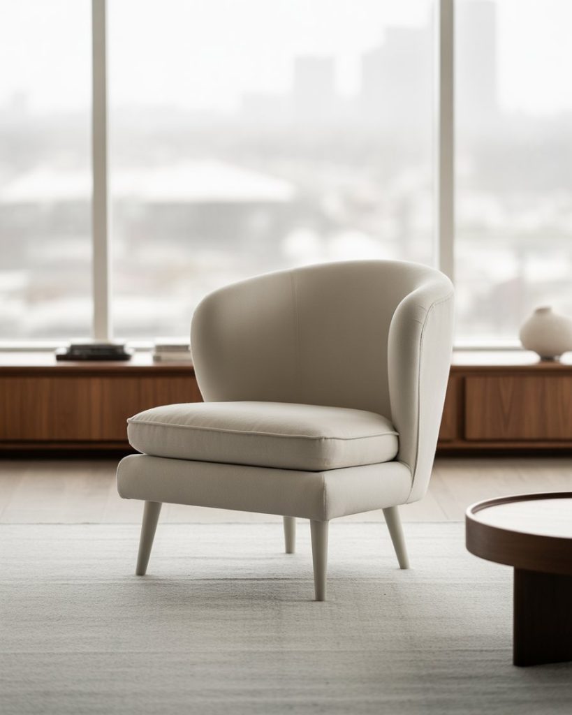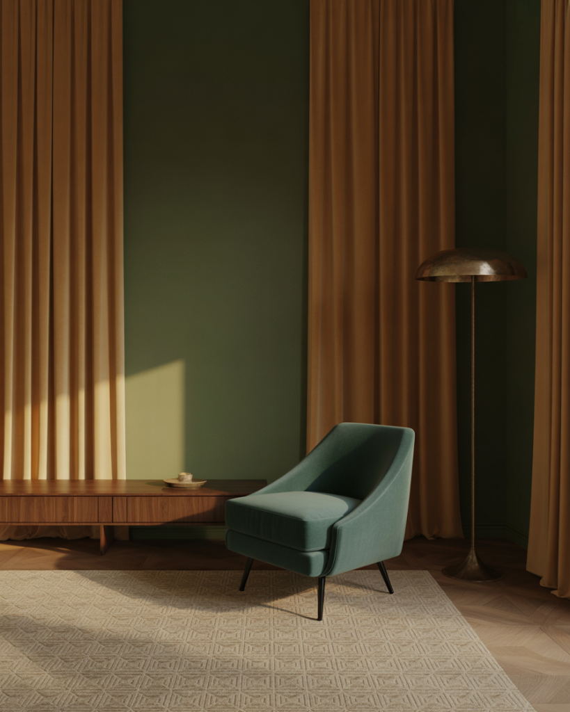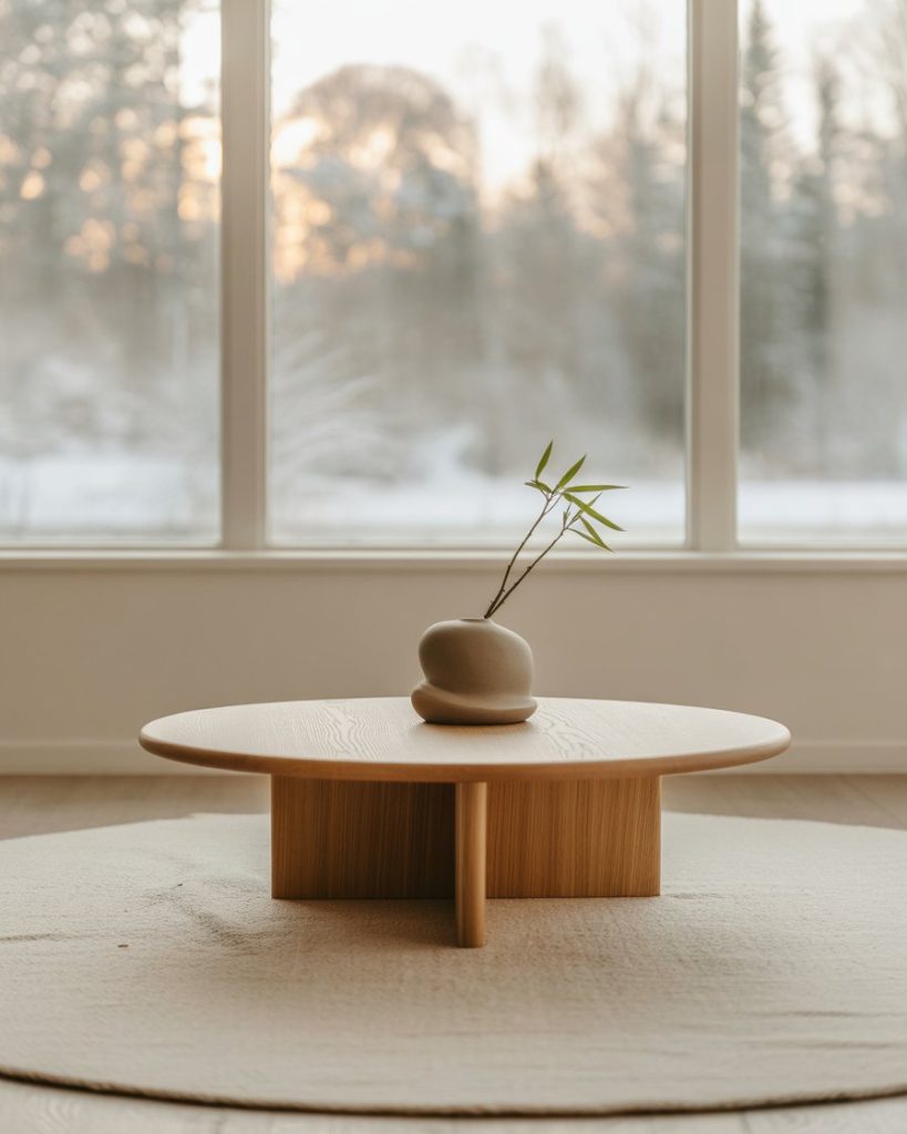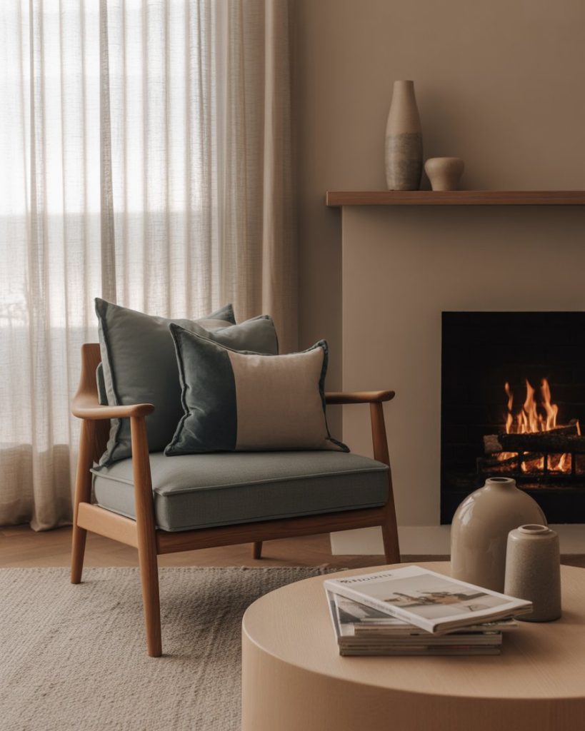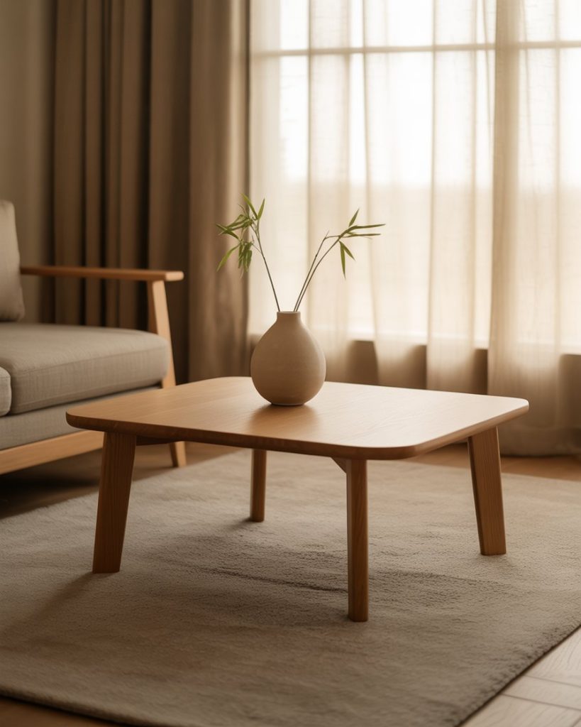 Blending Japandi serenity with Mid-Century warmth. Light oak tables, linen curtains, and a neutral-toned area rug promote relaxation. That neat balance between minimalist orderliness and natural texture makes it a dream for modern-day apartments.