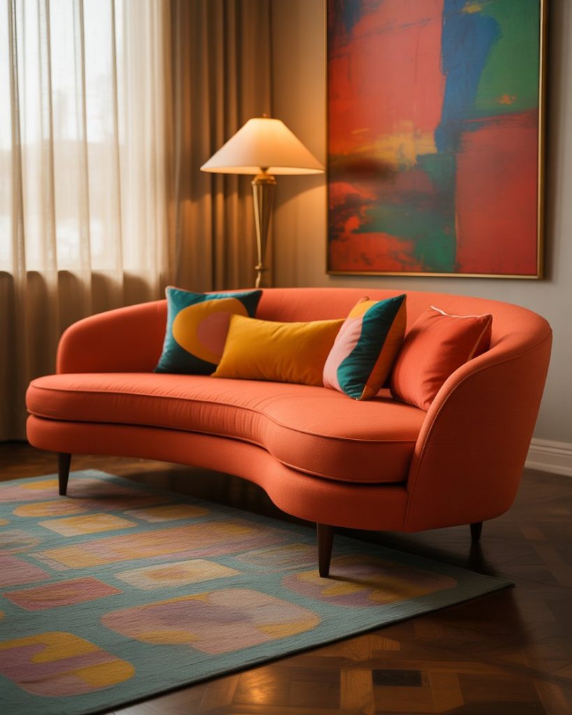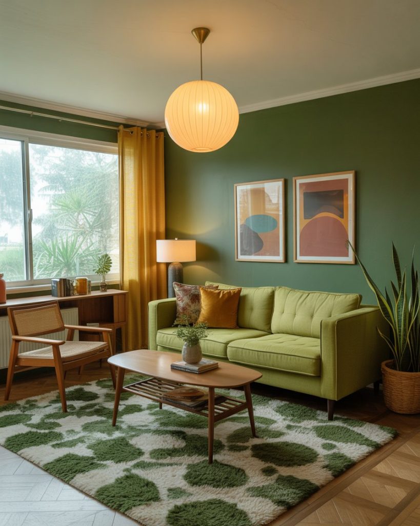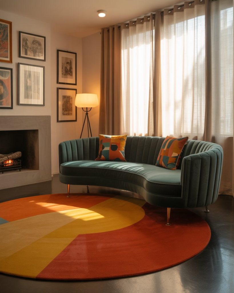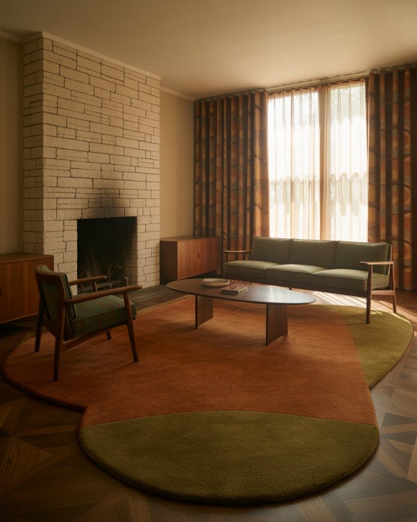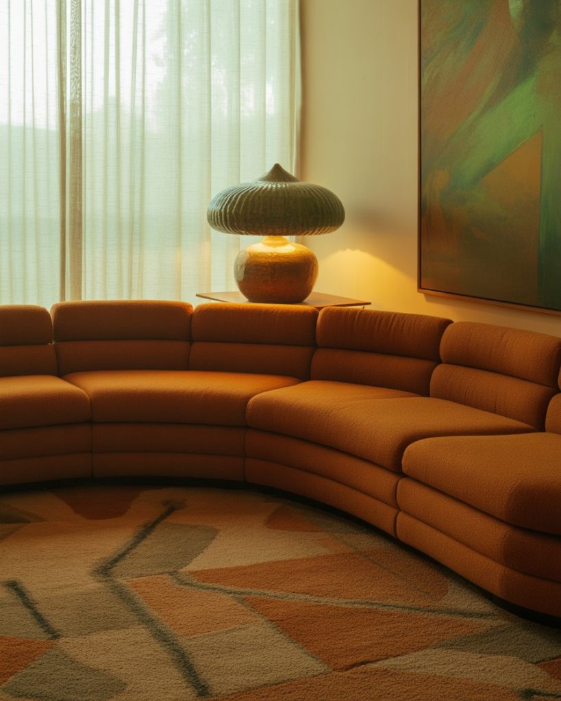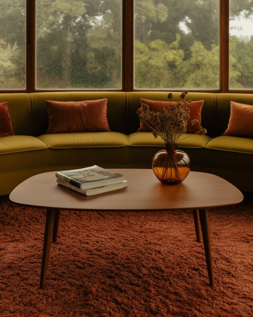The 70s style living room draws from such retro palettes as burnt orange, earthy green, and deep mustard. The shag rug and curves of the sectional all speak of similar ideas from retro interior design vintage, reminding us of the bold living rooms of the time.