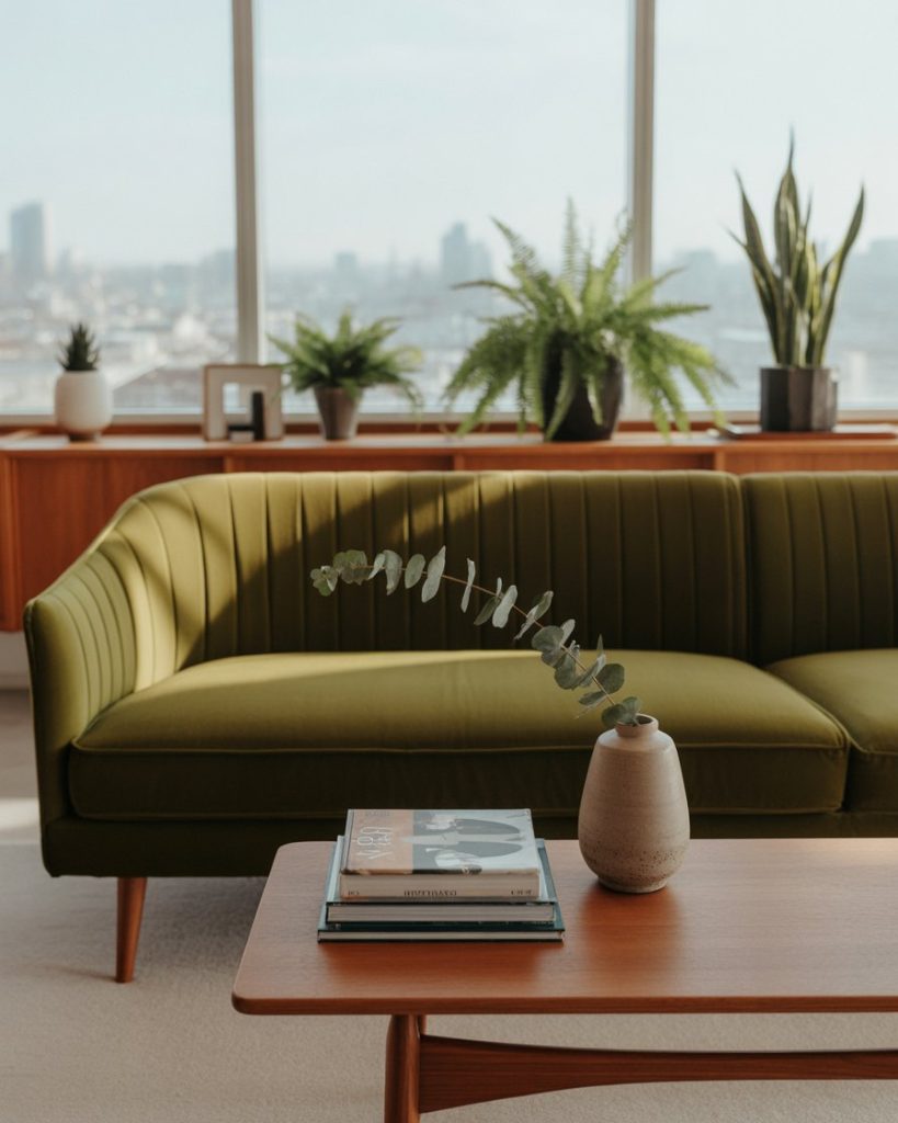 Adding any form of greenery makes mid-century interiors soft. Large sized fiddle leaf figs, pothos hanging down, or some succulents perched on wooden shelves bring with them life without overpowering the scheme. This works especially well in urban apartments where natural light is limited.
