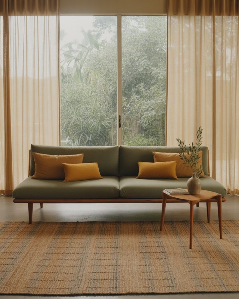The Japandi style is a fusion of gentle minimalist Japanese design and Scandinavian interior design. For a mid century living room, this means simple lines and light oak furniture in neutral hues. The rug is soft beige or off-white, adding comfort without seeming cluttered. The focus is on open ambience and calmness–perfect for city dwellers who find solace in tight apartments.