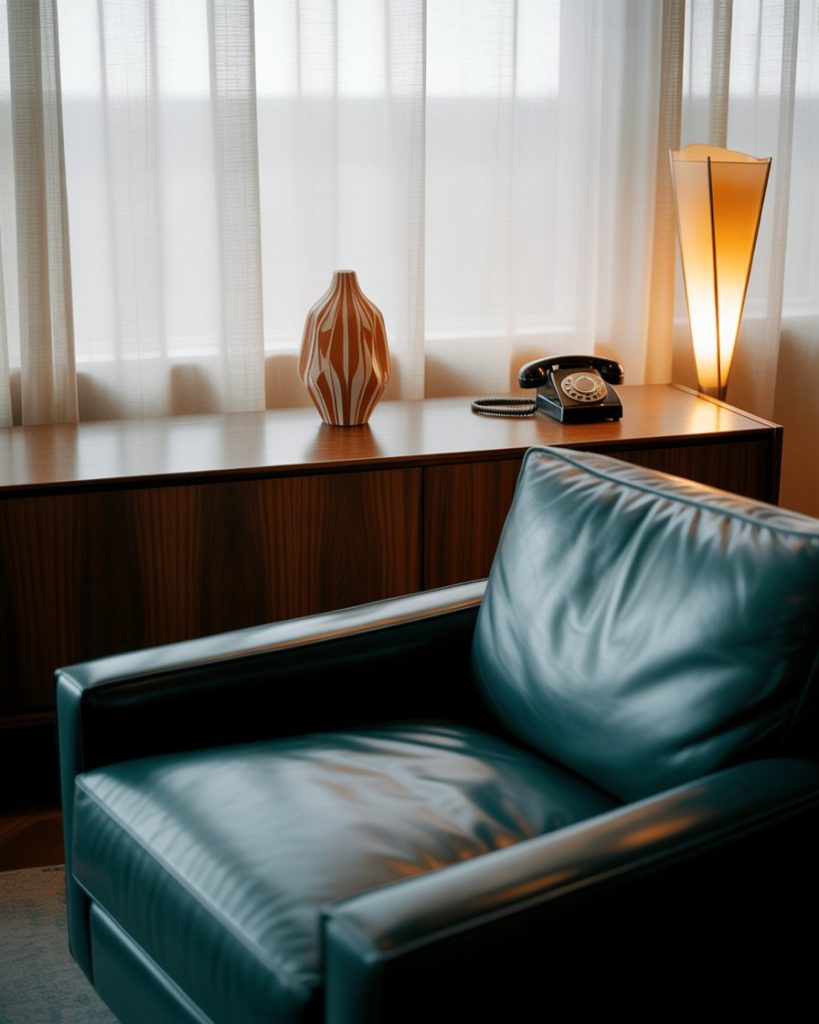 Japanese Walnut or teak furniture gives the right shade of dark contrast to white walls. The contrast from the leather furniture and the metallic elements follows thisp moody arrangement. This vintage approach may be said to lean back on the true vintage interior retro roots.