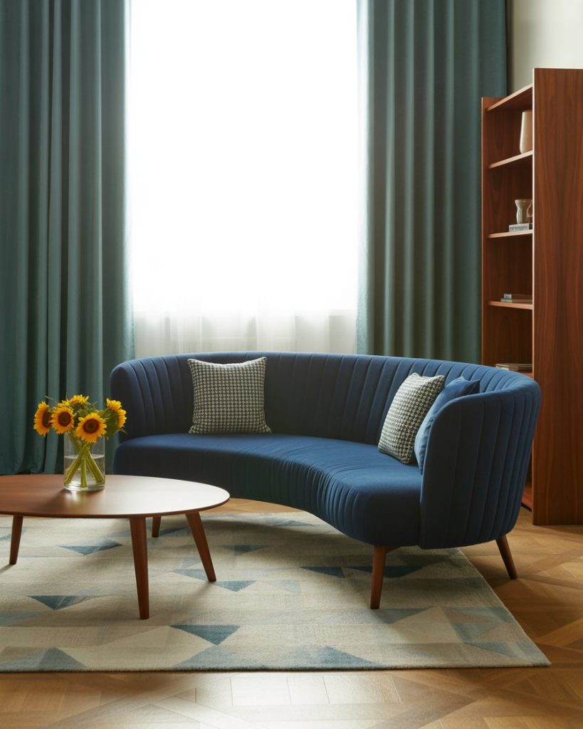 Applying blue shades adds freshness to mid-century interiors. Picture navy sofas, teal curtains, and cobalt ceramics. Set against natural woods and a neutral rug, the effect is rather stunning, but well grounded.