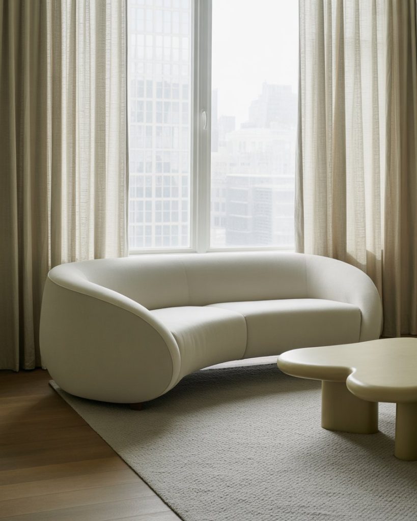 Pure white walls and ceilings provide a minimalist backdrop for the sculptural furniture. Pairing it with the lightest area rug and subtle wood tones adds a warm dimension. This works beautifully in little apartments, making them feel even larger.
