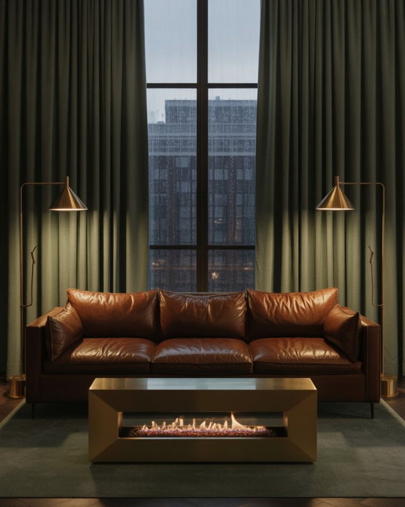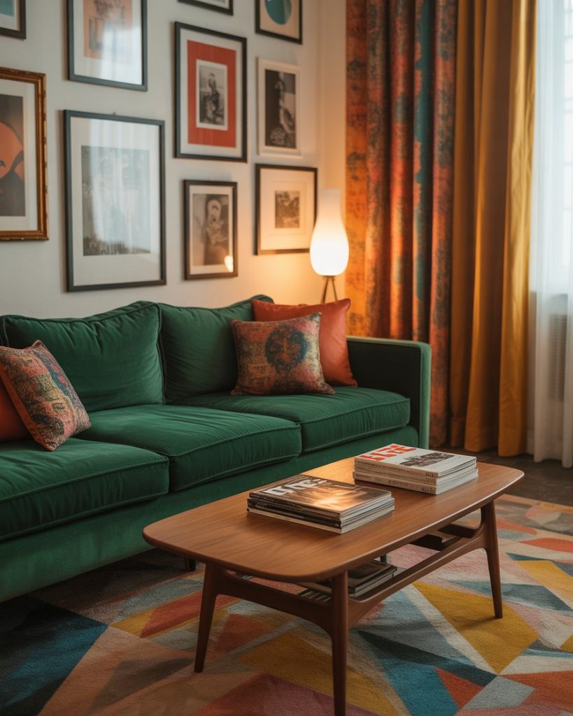 A dark mid century modern living room makes a striking statement. Deep navy or forest green walls paired with walnut furniture create a sophisticated vibe. Metallic accents and velvet curtains elevate the space, while a rug in muted tones grounds the layout. This design thrives in larger rooms where bold color choices amplify intimacy without feeling confined.