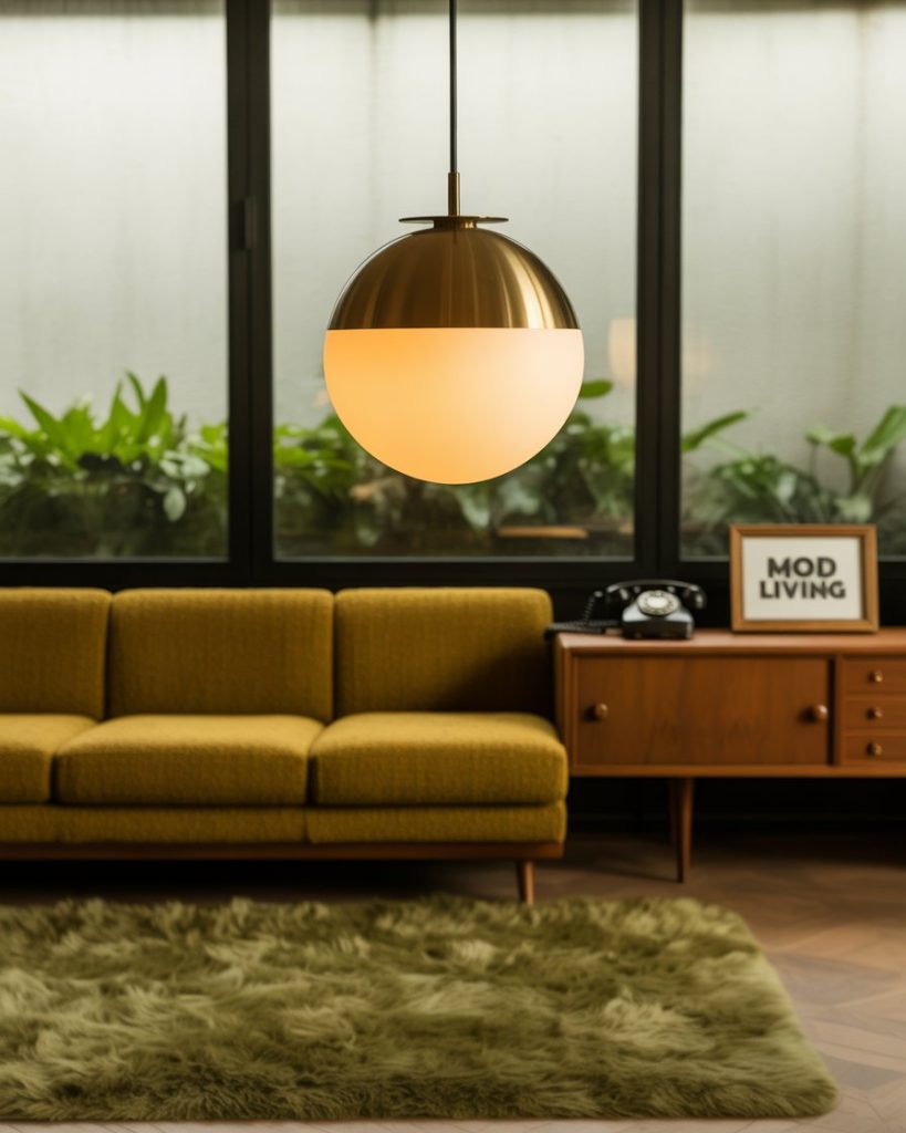 Anything from that era was enough to send chills down anyone trying to reminisce with a 70s interior retro vibe. Mustard yellows, avocado green, and low-profile sectionals set the tone. With the shag rug and another globe pendant light there to seal those throwback vibes. This is an energetic interpretation of the mid century living room that feels playful and bold-and is best for larger spaces where dishing out color experimentation does not win over too much attention.