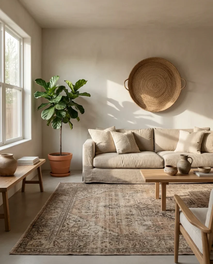 The secret to making this work is layering textures rather than colors. A single linen sofa becomes a whole mood when you add a boucle pillow, a rattan side table, and a jute rug underneath. Designers consistently point out that rooms painted in warm off-whites photograph better, feel larger, and age more gracefully than stark bright whites. If you’re nervous about committing to a wall color, start with Benjamin Moore’s White Dove or Sherwin-Williams Accessible Beige—both are perennial crowd-pleasers that pair beautifully with natural wood tones.