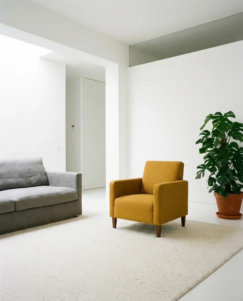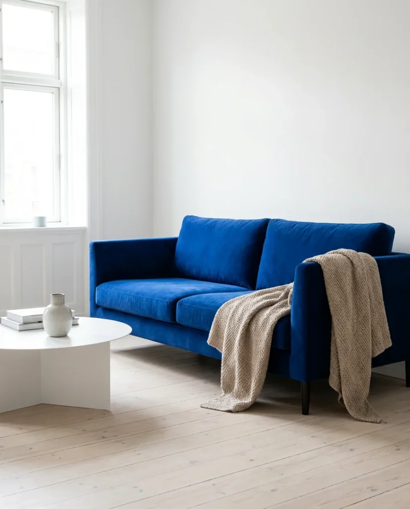 Minimalism and colorful interiors aren’t mutually exclusive—you just have to be very deliberate about where the color lands. The most effective approach is what designers call “clean bones, bold accents”: a room that is fundamentally quiet and structured, punctuated by one or two genuinely bold color moments. A cobalt blue sofa against white walls. A single mustard-yellow armchair in a grey room. A pair of emerald green velvet cushions on an otherwise neutral sectional. The color works because the room around it is so calm—it’s the difference between a painting and a wall covered in paintings.