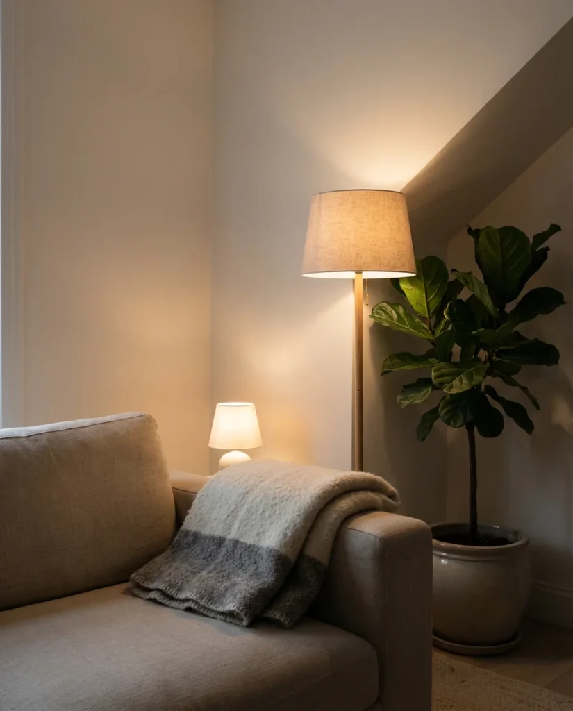 The biggest pushback against minimalism has always been that it feels cold. Cozy minimalism is the design community’s direct answer to that criticism. It keeps the clean lines and intentional restraint of classic minimalism but layers in genuine warmth through textiles, lighting, and natural materials. A chunky knit throw folded over one arm of a sofa. A beeswax candle on the coffee table. A single warm-toned floor lamp casting amber light across the room in the evening. These small additions don’t create clutter—they create atmosphere, which is something minimalism desperately needs.