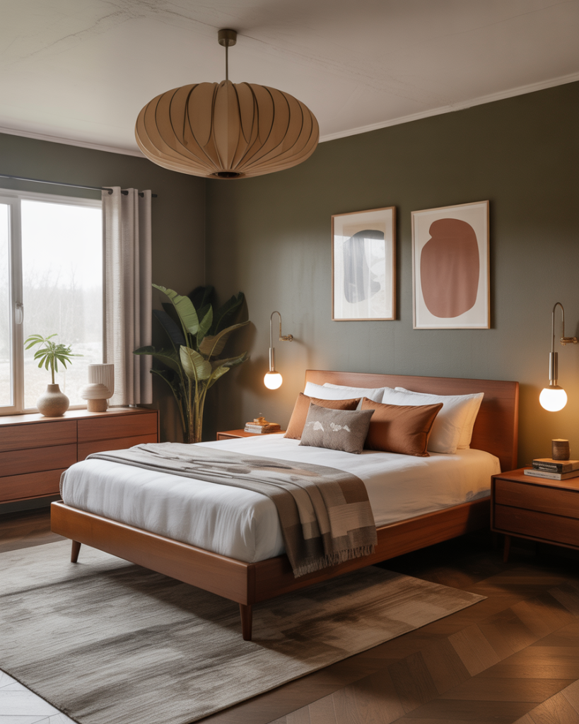 The mid-century aesthetic has never really left us, but in 2026 it is seeing a revival in interior design with softer lines, earthy colors, and natural wood accents. These bedrooms celebrate both vintage character and modern comfort, blending teak furniture with clean-lined storage. A cozy mid century feel can be achieved with muted fabrics and sculptural lighting, creating warmth without clutter. This timeless style continues to prove why it’s the darling of designers like Jonathan Adler.