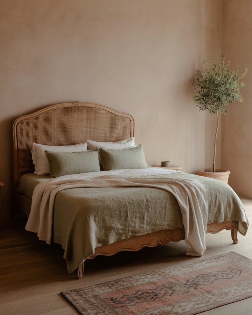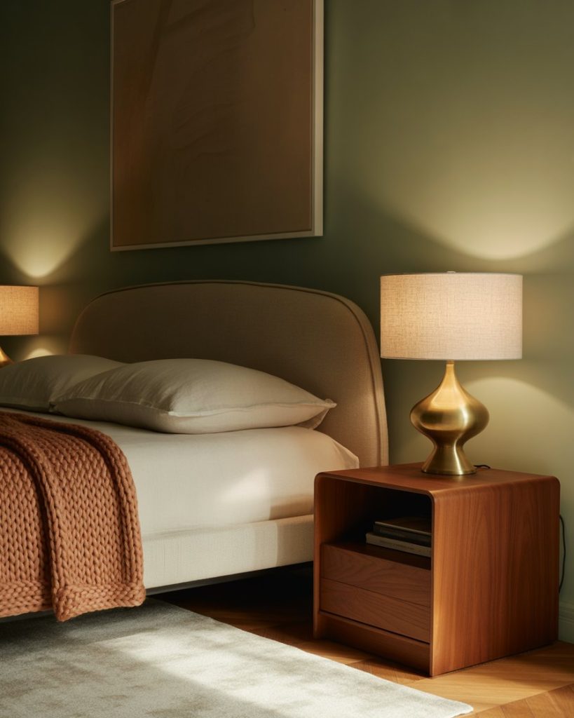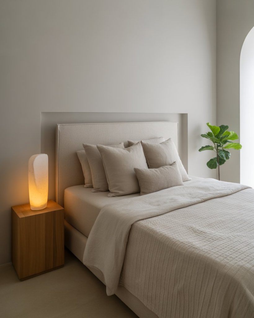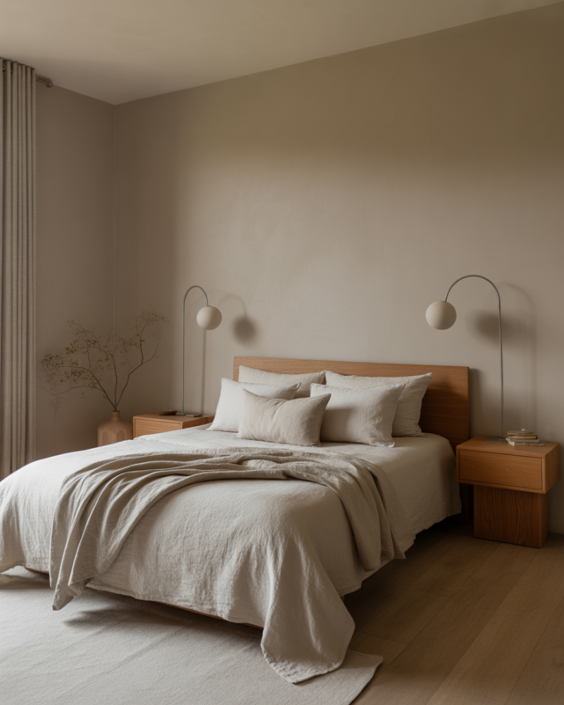Minimalism is evolving beyond stark white walls. In 2026, organic forms meet minimalist calm, bringing soft natural materials into play. Think raw oak, linen bedding, and curved bedside lamps. These spaces feel cozy and welcoming instead of cold, with earthy textures and handmade decor touches that soften sleek lines. It’s the perfect example of design meeting wellness, endorsed by wellness bloggers like Athena Calderone of Eyeswoon.