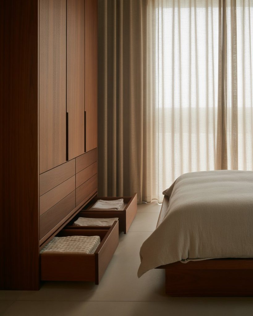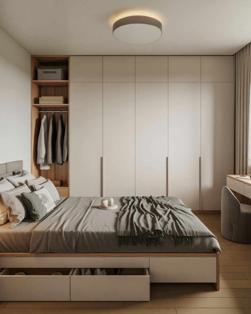 Clutter-free living is key in 2026. Bedrooms maximize space through hidden wardrobes, bed bases with drawers, and sleek panels. This interior design solution combines classic function with modern style. It’s especially loved in urban apartments, where every inch counts, making the space feel more cozy and open.