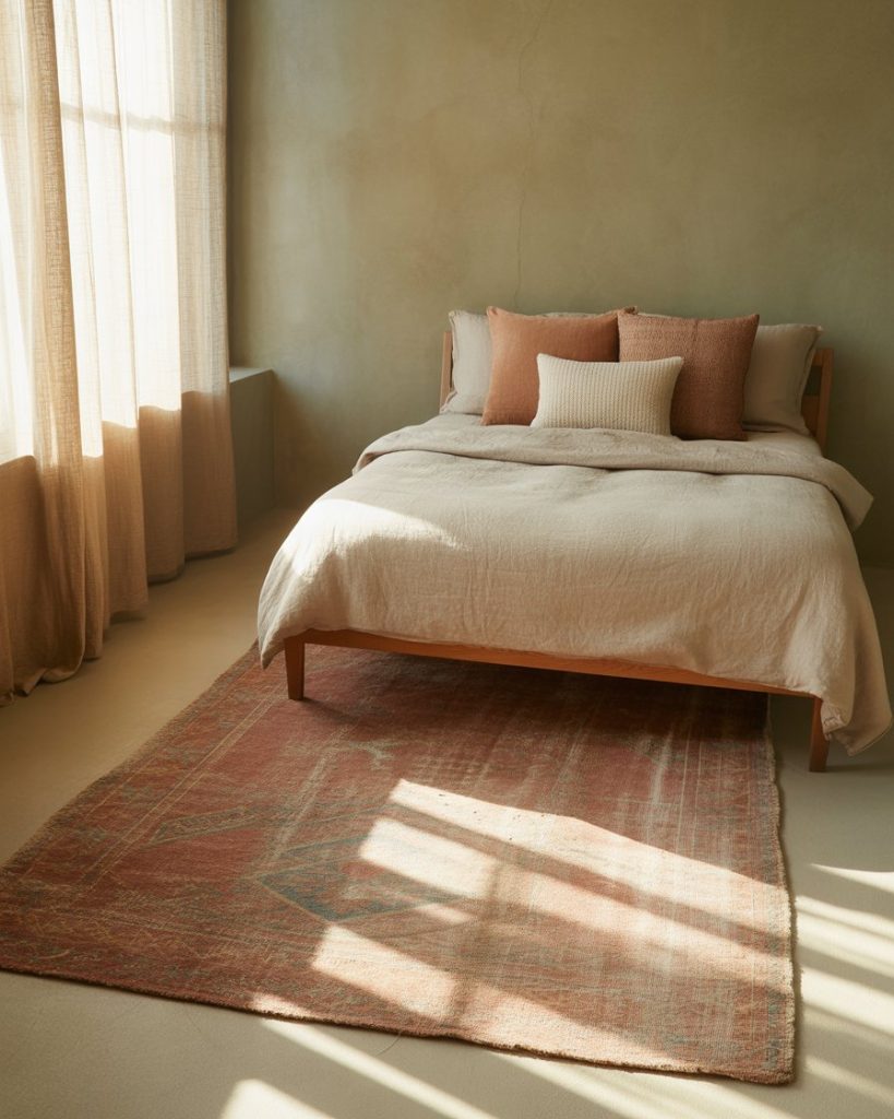Warm, earthy palettes are a staple of 2026 bedrooms. Ochre, terracotta, clay, and sage dominate, supported by tactile finishes like plastered walls or raw stone. This idea works well in both city apartments and suburban homes, giving the room a grounding feel. Pair it with vintage rugs and rustic furniture to bring in a timeless authenticity. It’s a simple way to create balance and intimacy in a space.
