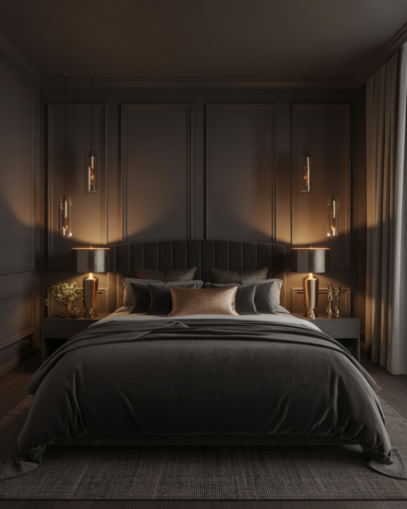 While many lean toward neutrals, dark bedrooms have emerged as a statement of design luxury. Deep charcoal walls, dark woods, and matte finishes create a dramatic yet intimate environment. Layering in metallic accents or velvet bedding adds sophistication. Designers on Elle Decor have noted that dark bedrooms can actually feel cozy rather than gloomy when combined with warm lighting.