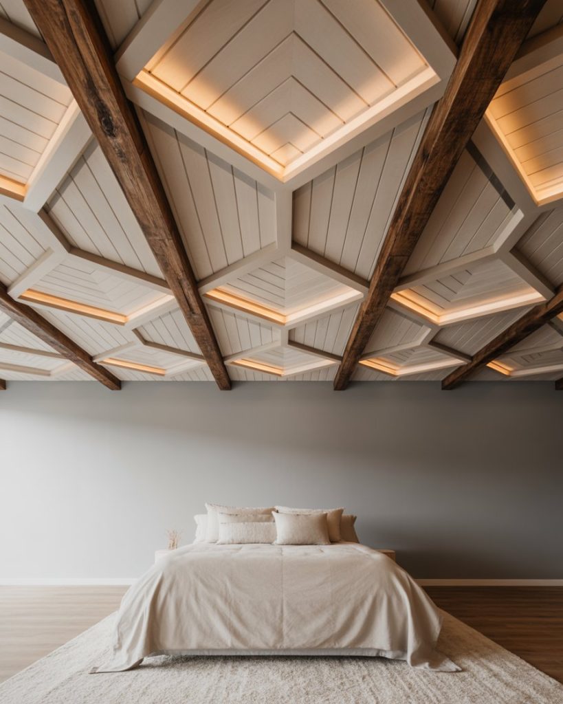 Too often overlooked, the ceiling is now central to interior design. From ceiling design ideas featuring wood beams, recessed LED lighting, or geometric patterns, bedrooms in 2026 use the “fifth wall” to make bold statements. A sculptural ceiling can transform a plain room into a masterpiece, whether you’re drawn to classic coffered designs or sleek futuristic panels.