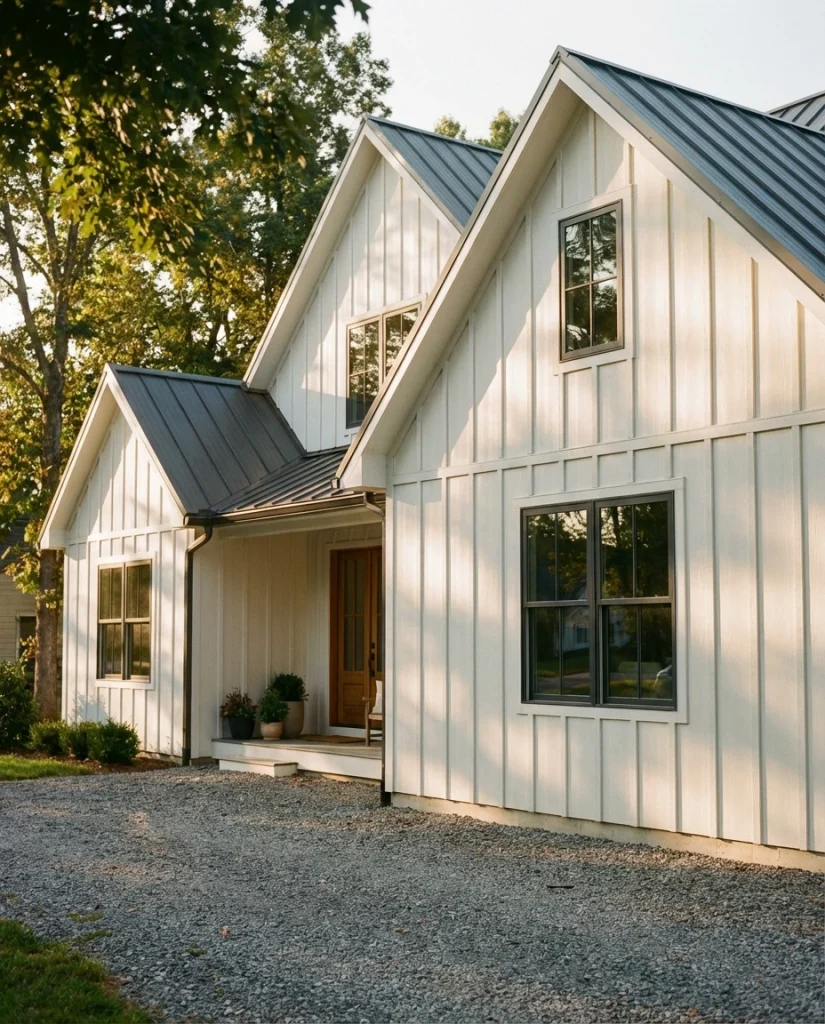The vertical board-and-batten treatment brings dimensional texture to modern farmhouse facades, creating shadow lines that shift throughout the day and add visual interest without overwhelming the design. This approach works exceptionally well when you pair crisp white or warm cream siding with charcoal-painted battens, window frames, and fascia boards, establishing a balanced contrast that feels both modern and rooted in agricultural building traditions. The vertical orientation elongates the home’s appearance, making it particularly effective for single-story structures or those with lower rooflines that benefit from the upward visual pull.